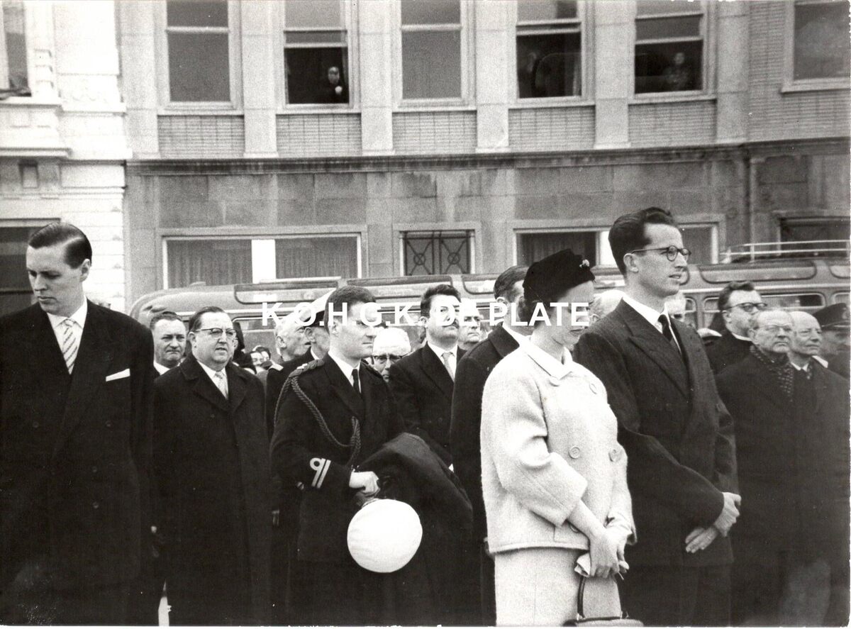 Foto : 13 x 18 cm. - De Koning en de Koningin op het Zeeheldenplein voor de plechtigheid aan het Monument der Zeelieden. We herkennen o.a. van links naar rechts : burgemeester Jan Piers, schepen John Lauwereins, de vleugeladjudant van de koning burggraaf Edmond Poullet en schepen Roger De Kinder. Map 014B/97