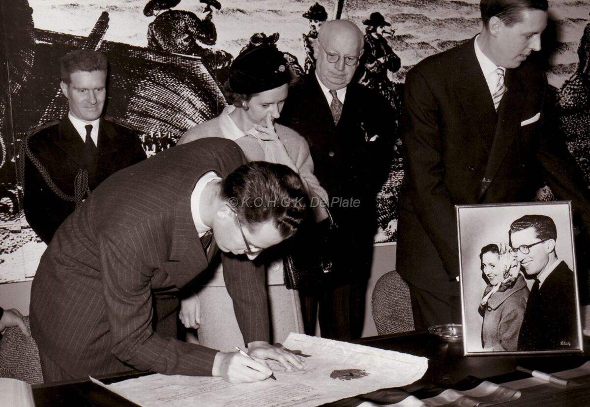 Formaat : 13 x 18 cm. - Koning Boudewijn ondertekent de "Verklaring van Eigendom" waarbij hij en Koningin Fabiola de eerste reders ter visserij zijn geworden van het motorvissersschip O.1 "Fabiola. Hier op het Stadhuis. Rechts, burgemeester Jan Piers, achter hem stadssecretaris Michel Surmont. Achter de koning, zijn vleugeladjudant burggraaf Edmond Poullet.