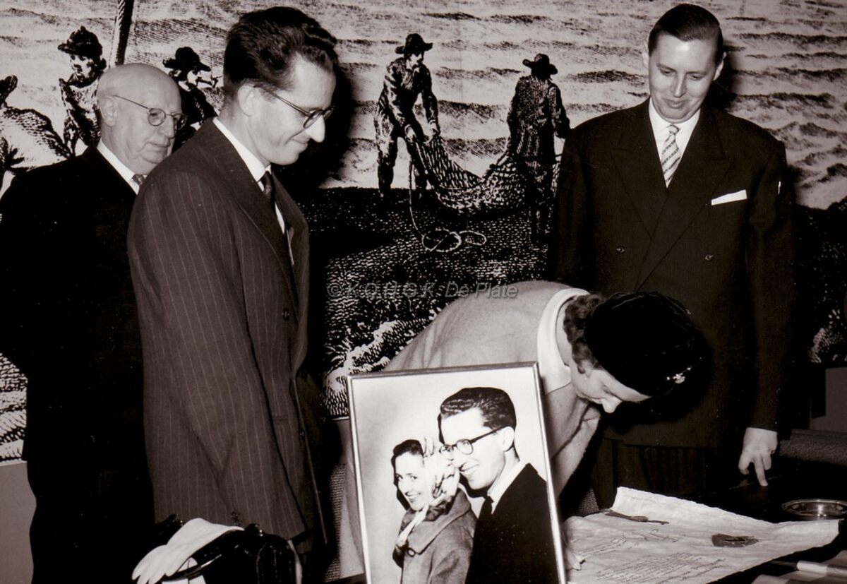 Formaat : 13 x 18 cm. - Koningin Fabiola ondertekent de "Verklaring van Eigendom", waarbij zij en Koning Boudewijn de eerste reders ter visserij zijn geworden van het motorvissersschip O.1 "Fabiola". Hier op het stadhuis. Naast haar koning Boudewijn. Rechts, burgemeester Jan Piers. Links, stadsecreataris Michel Surmont