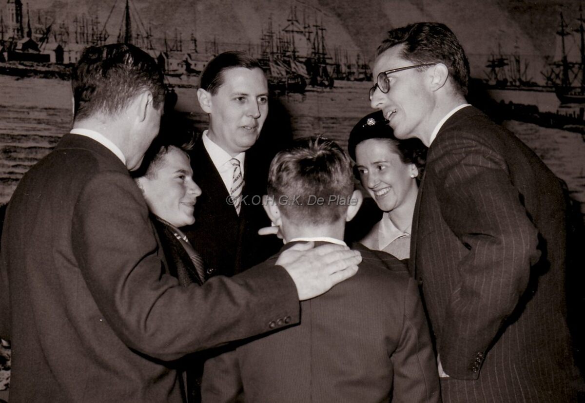 Formaat : 13 x 18 cm. - Plechtige ontvangst op het Stadhuis. Koning Boudewijn en Koningin Fabiola woonden de uitreiking bij van de premies aan scheepsjongens en reders. Hier met burgemeester Jan Piers in gesprek met een paar jongens.