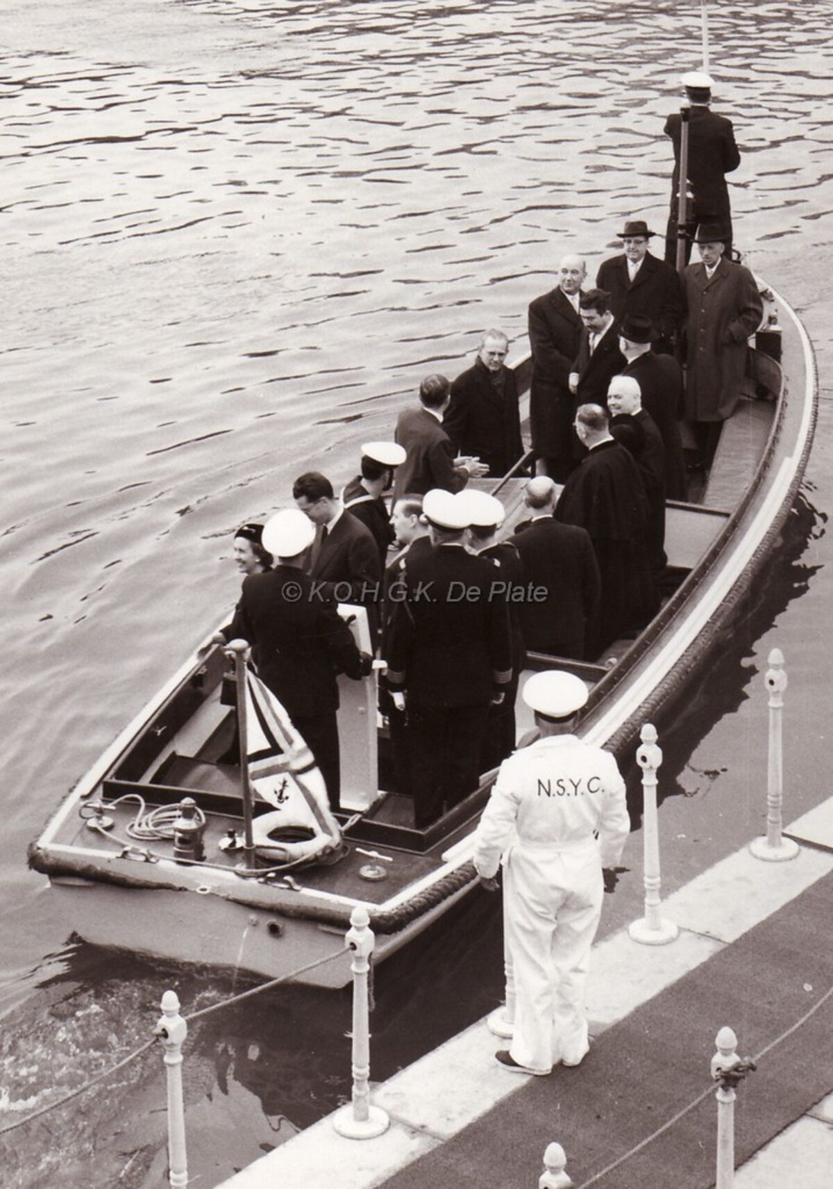 Formaat : 18 x 13 cm. - Koning Boudewijn en Koningin Fabiola met burgemeester Jan Piers en het schepencollege aan boord van een sloep van de Zeemacht, varen vanaf de Royal North Sea Yacht Club naar hun huweluksbootje de O.1 "Fabiola"