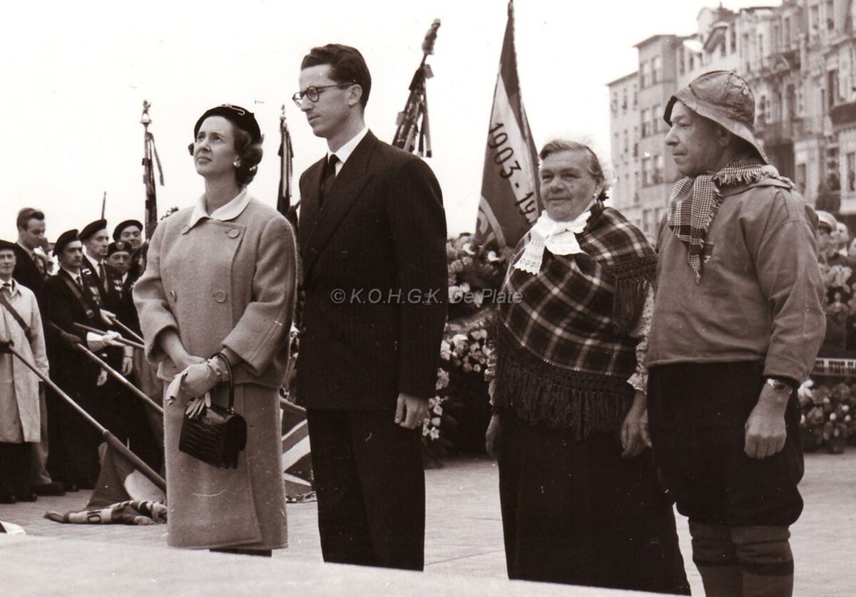 Formaat : 13 x 18 cm. - Groet van Koning Boudewijn en Koningin Fabiola aan het Monument der Zeelieden op het Zeeheldenplein. Naast hen, twee leden van de folkloregroep "De Vismijnvrienden".