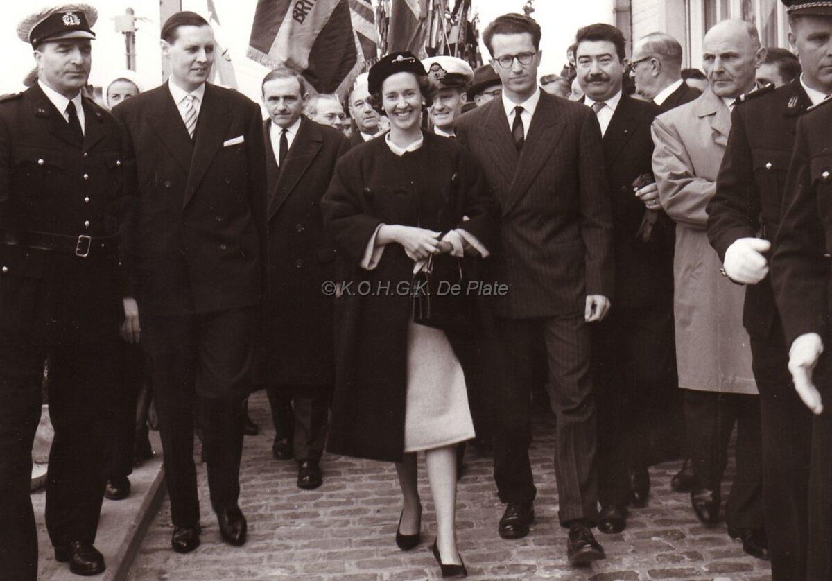 Formaat : 13 x 18 cm. - Koning Boudewijn en Koningin Fabiola na de bloemenhulde aan het Monument der Zeelieden nabij de Royal North Sea Yacht Clib. Met burgemeester Jan Piers, provinciegouverneur van West-Vlaanderen Pierre van Outryve d'Ydewalle en schepen Roger De Kinder. Tussen de koning en de koningin, de vleugeladjudant van de koning, burggraaf Edmond Poullet
