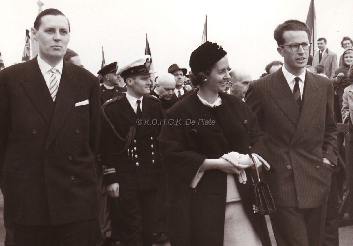 Formaat : 13 x 18 cm. - Koning Boudewijn en Koningin Fabiola op weg naar de Royal North Sea Yacht Club na de bloemenhulde aan het Monument der Zeelieden. Links, burgemeester Jan Piers. Achter hen burggraaf Edmond Poullet, de vleugeladjudant van de koning en later vice-admiraal van de Zeemacht.