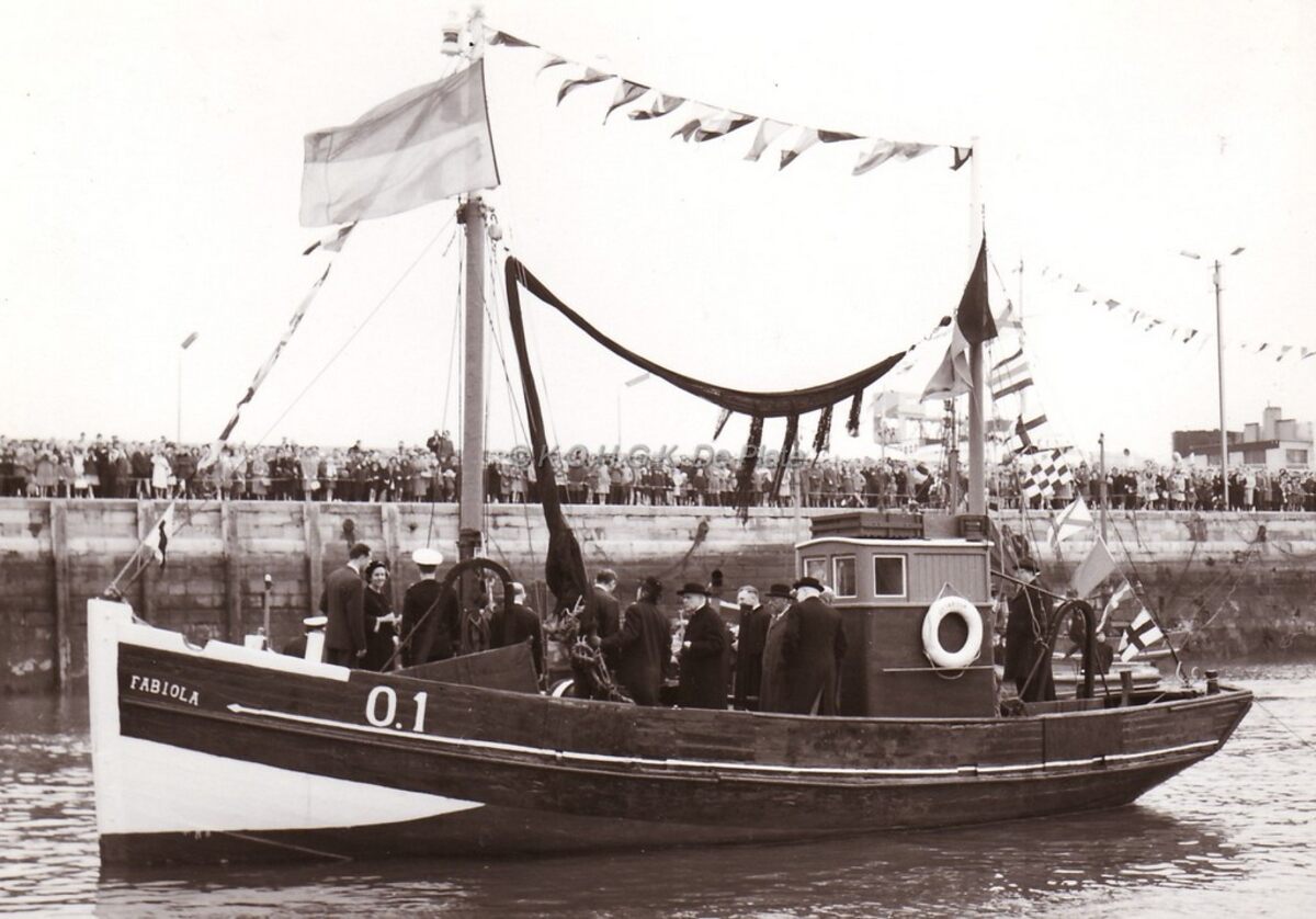 Formaat : 13 x 18 cm. - Het vissersvaartuig de O.1 "Fabiola" dat als huwelijksgeschenk door de stad werd gegeven aan Koning Boudewijn en Koningin Fabiola, in het Montgomerydok.