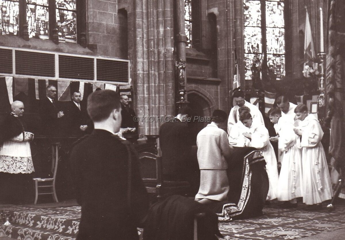 Formaat : 13 x 18 cm. - Koning Boudewijn en Koningin Fabiola tijdens de traditionele vissersmis in de Sint Petrus en Pauluskerk. De mis werd opgedragen door E.H. Evrard, aalmoezenier der visserij. Die dag legden zij ook bloemen neer aan het Monument der Zeelieden en ontvingen van de stad Oostende als huwelijksgeschenk het vissersvaartuig de O.1 "Fabiola".