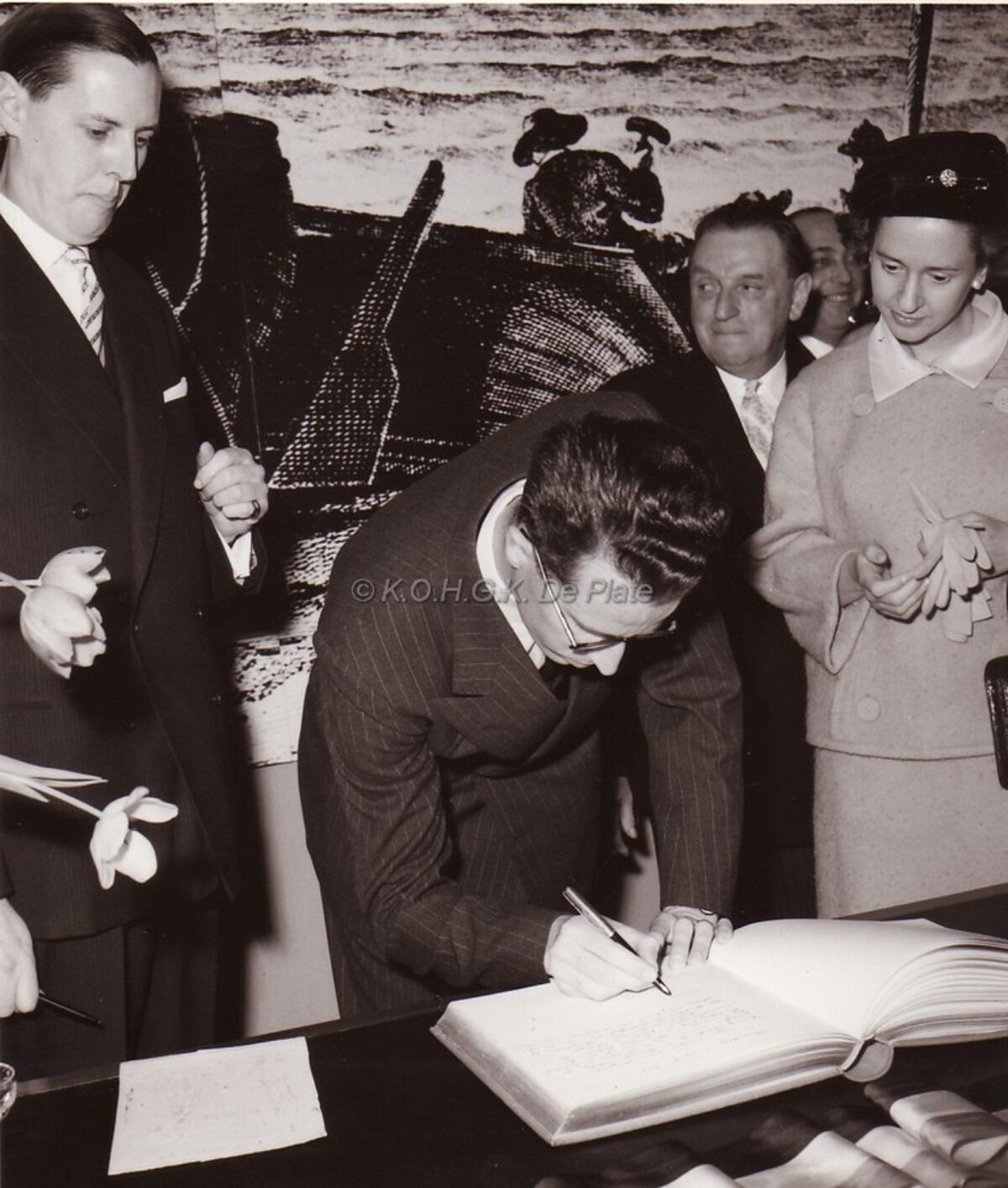 Formaat : 13 x 18 cm. - Plechtige ontvangst op het Stadhuis. Koning Boudewijn ondertekent het Gulden Boek van de Stad Oostende onder het oog van Koningin Fabiola en burgemeester Jan Piers. Achter de koningin, feestbestuurder Aloïs Dennekin