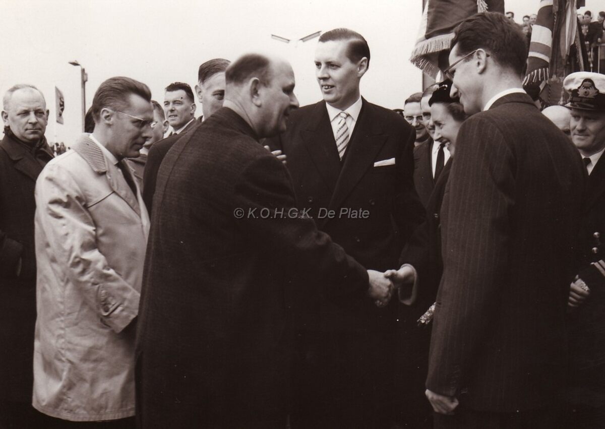 Formaat : 13 x 18 cm. Links, Prosper Vandenberghe, uitgever van Het Visserijblad. Koningin Fabiola en Koning Boudewijn begroeten de vissersgemeenschap. Centraal, burgemeester Jan Piers. Uiterst rechts, burggraaf Edmond Poullet, de vleugeladjudant van de koning en latere vice-admiraal bij de Zeemacht.