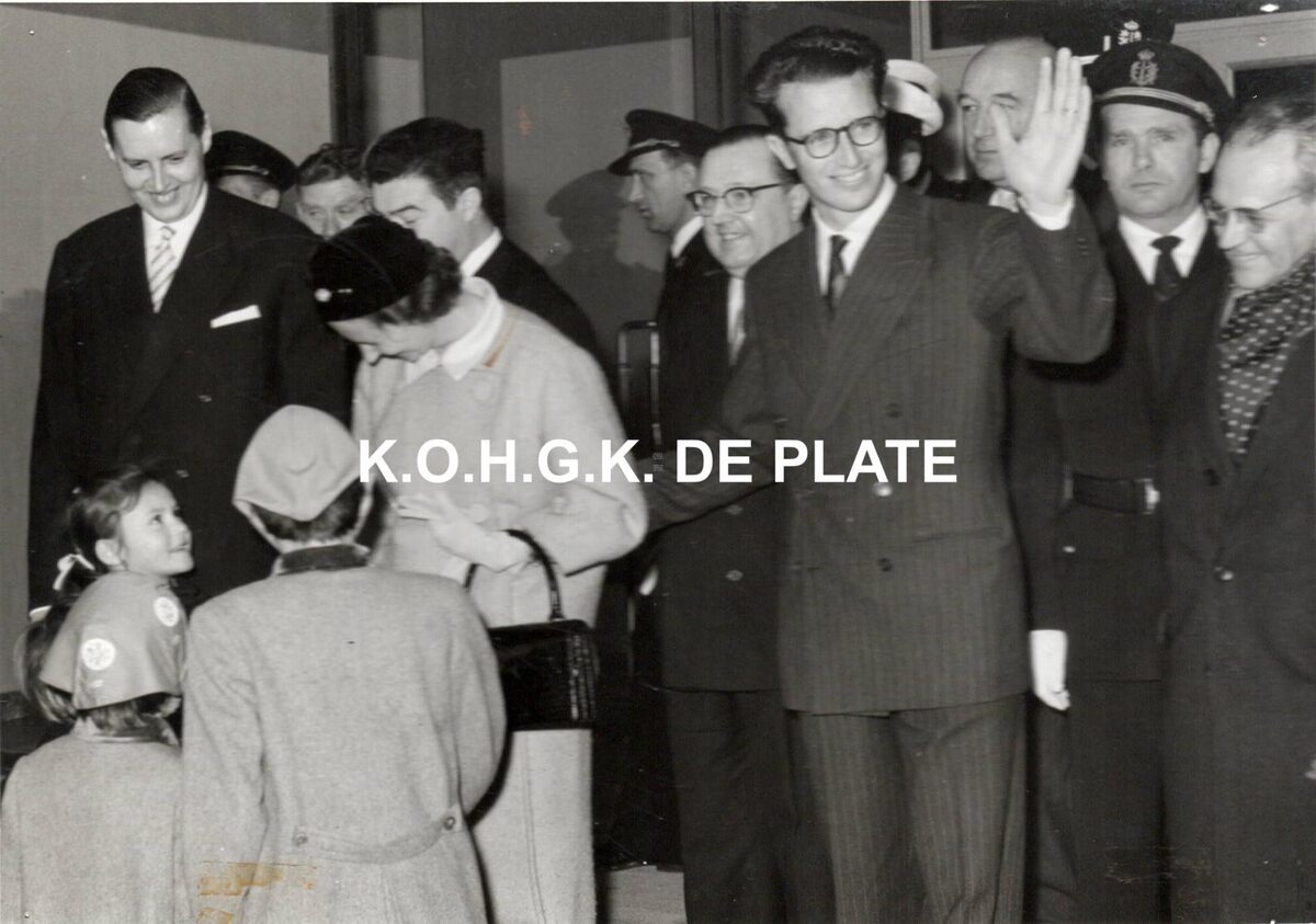 Formaat : 13 x 18 cm. - Koning Boudewijn en Koningin Fabiola worden ontvangen door het stadsbestuur. De koningin houdt een babbel met de jeugd. Achter het koningspaar, van links naar rechts : burgemeester Jan Piers, de schepenen Roger De Kinder, John Lauwereins, Kamiel Dehouck en Frans Van Caillie.