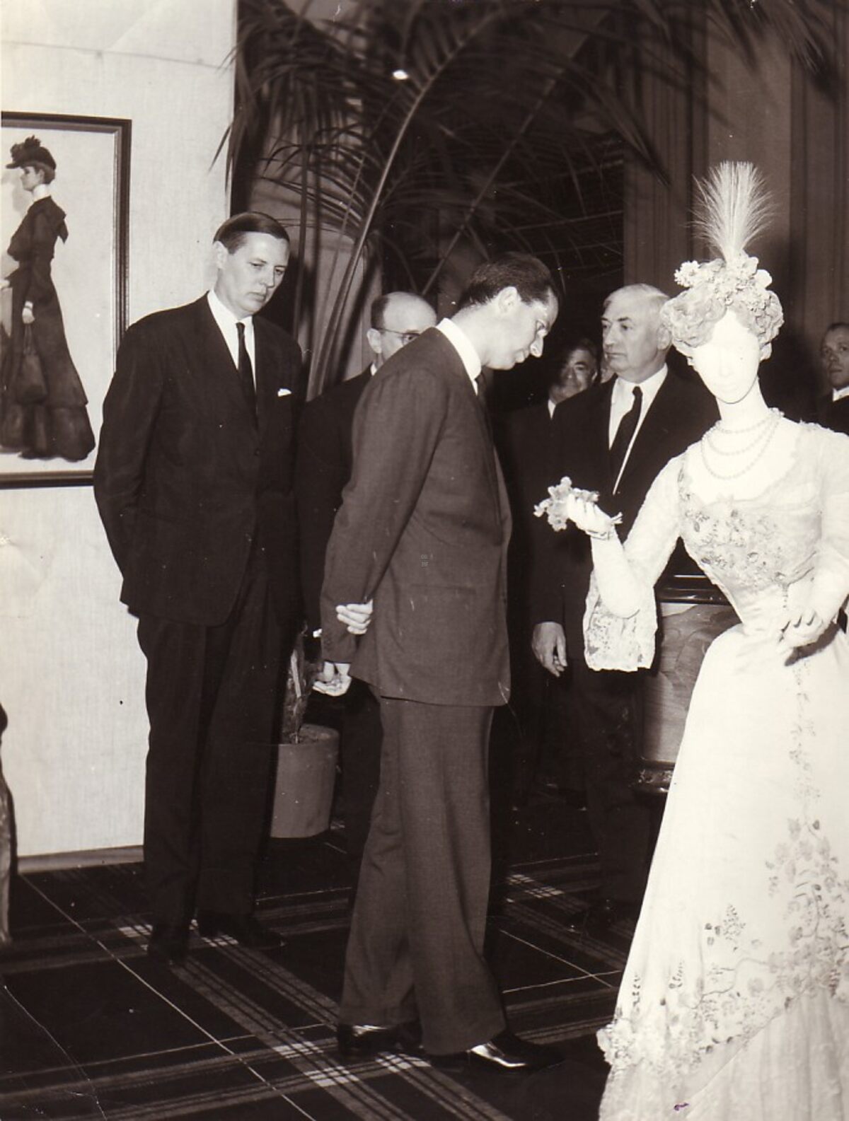 Formaat : 18 x 24 cm. Bijwonen van het vorstenpaar van de opening van de tentoonstelling "Europa 1900" in het Casino-Kursaal. Van links naar rechts : Jan Piers, Theo Lefevre, Koning Boudewijn, (?), Felix Labisse, Dick Ginckels