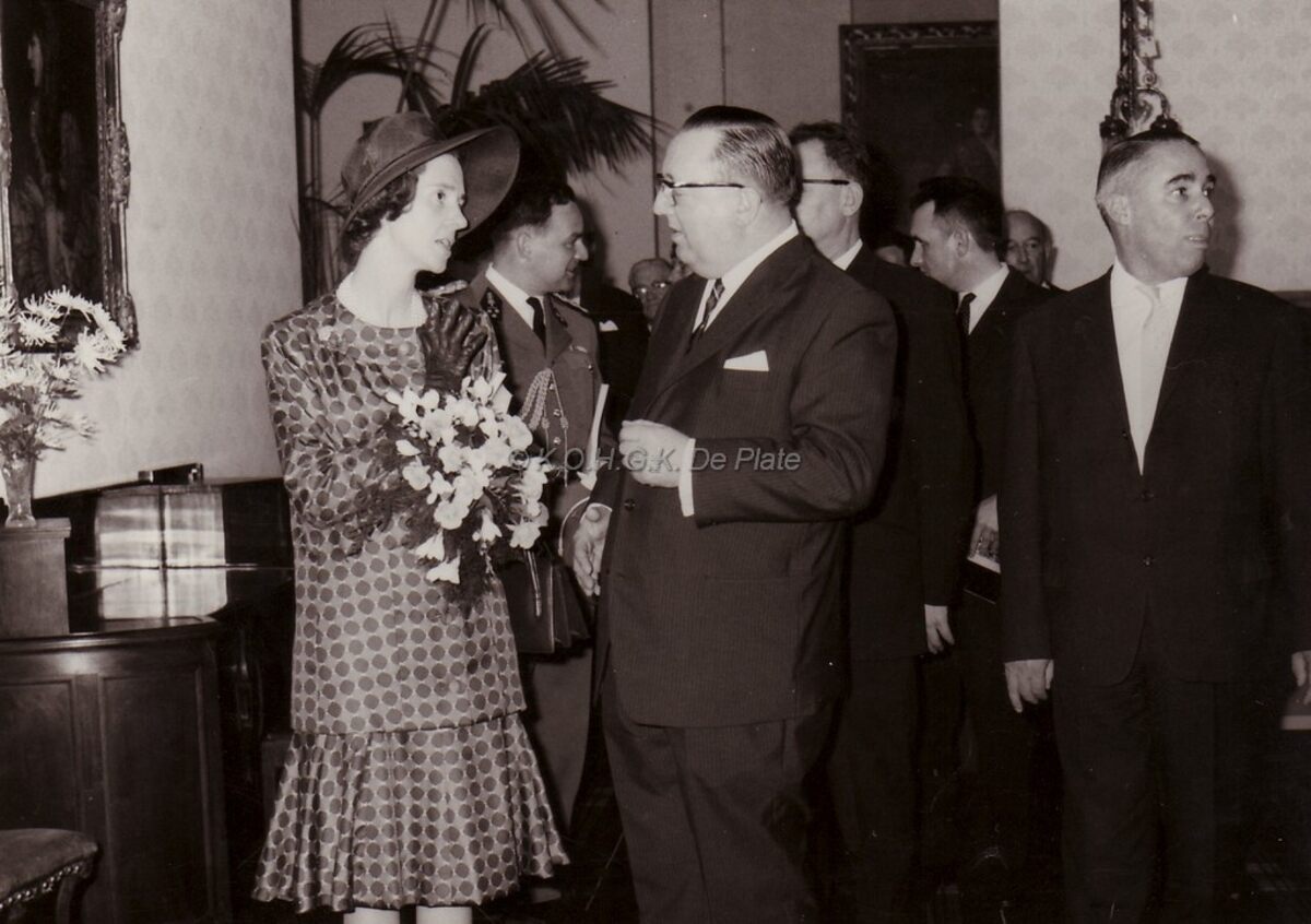 Formaat : 13 x 18 cm. - Koningin Fabiola in gesprek met waarnemend burgemeester John Lauwereins tijdens de openng van de tentoonstelling "Europa 1900" in het Museum voor Schonde Kunsten. Rechts, schepen Raymond Miroir