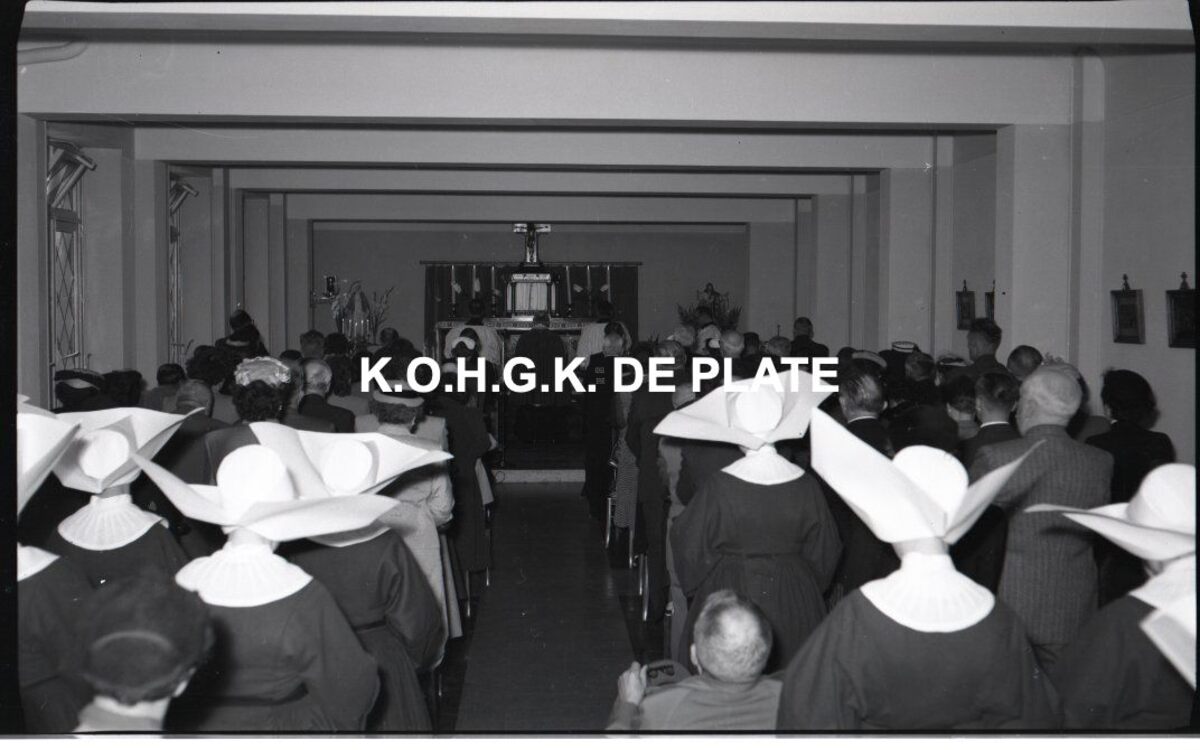 Negatief : 6 x 9 cm. - Religieuze plechtigheid in de kapel. Op de rug gezien, zusters van de Dochters der Liefde (van Vincentius à Paulo).