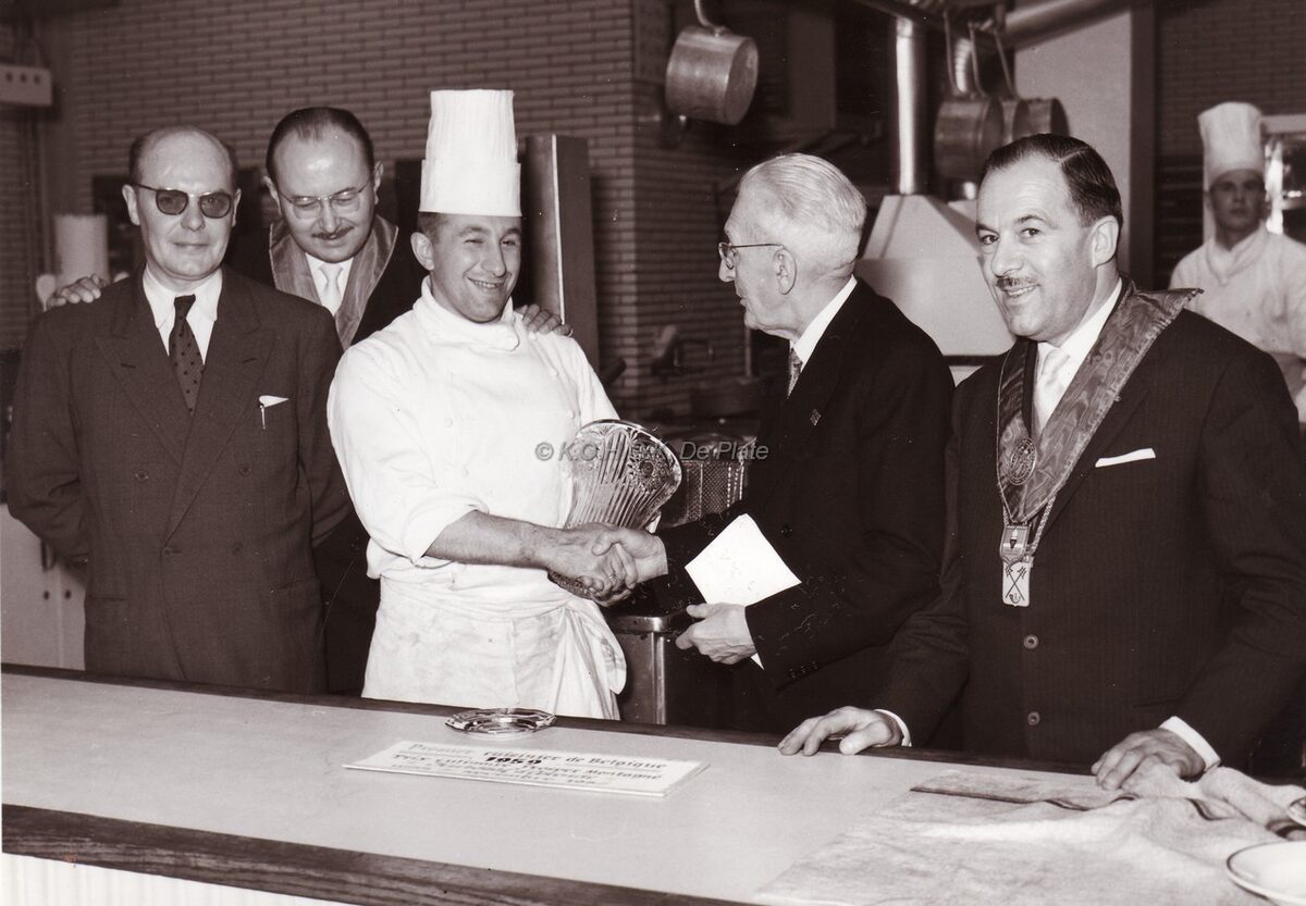 De winnaar Jean Vanandruel krijgt felicitaties van Gaston Clemen, voorzitter van de technische jury. Links van de winnaar, Roger De Ramée, voorzitter van de "Club Prosper Montagnée".