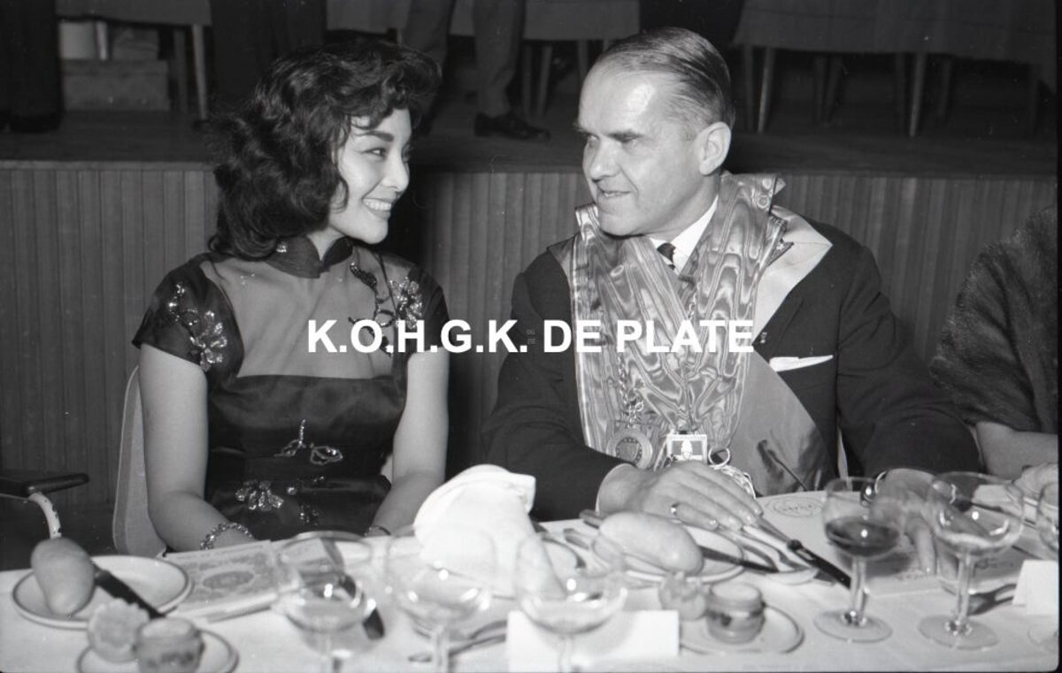 Negatief : 6 x 9 cm. - Burgemeester Adolf Van Glabbeke in het gezelschap van mevrouw Tsuan Liou. - Bron : Het Kustblad, 05/11/1958