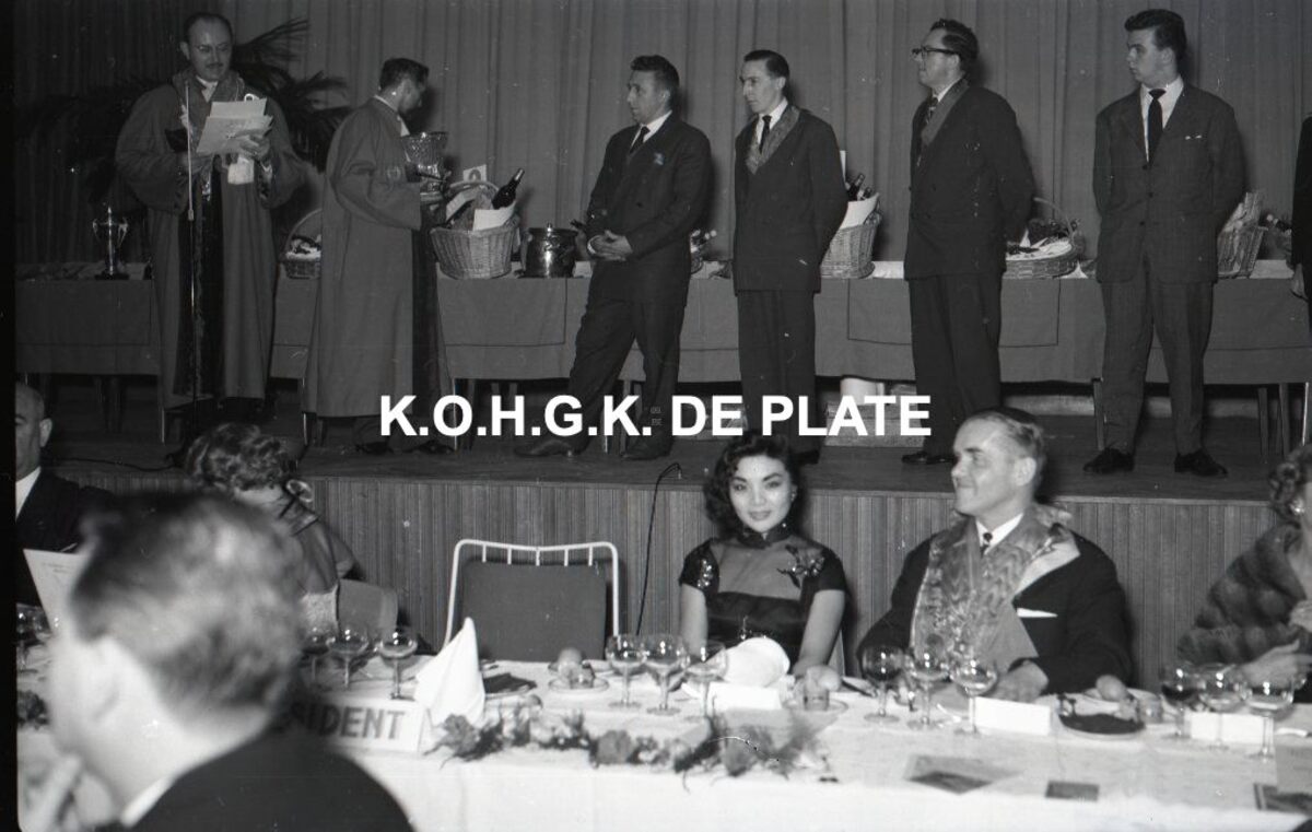 Negatief : 6 x 9 cm. - Roger De Ramée feliciteert de winnaars van de kookwedstrijd "Prosper Montagné". Aan het banket in de ambassadeurszaal, burgemeester Adolf Van Glabbeke en naast hem, mevrouw Tsuan Liou. Bron : Het Kustblad, 05/11/1958.