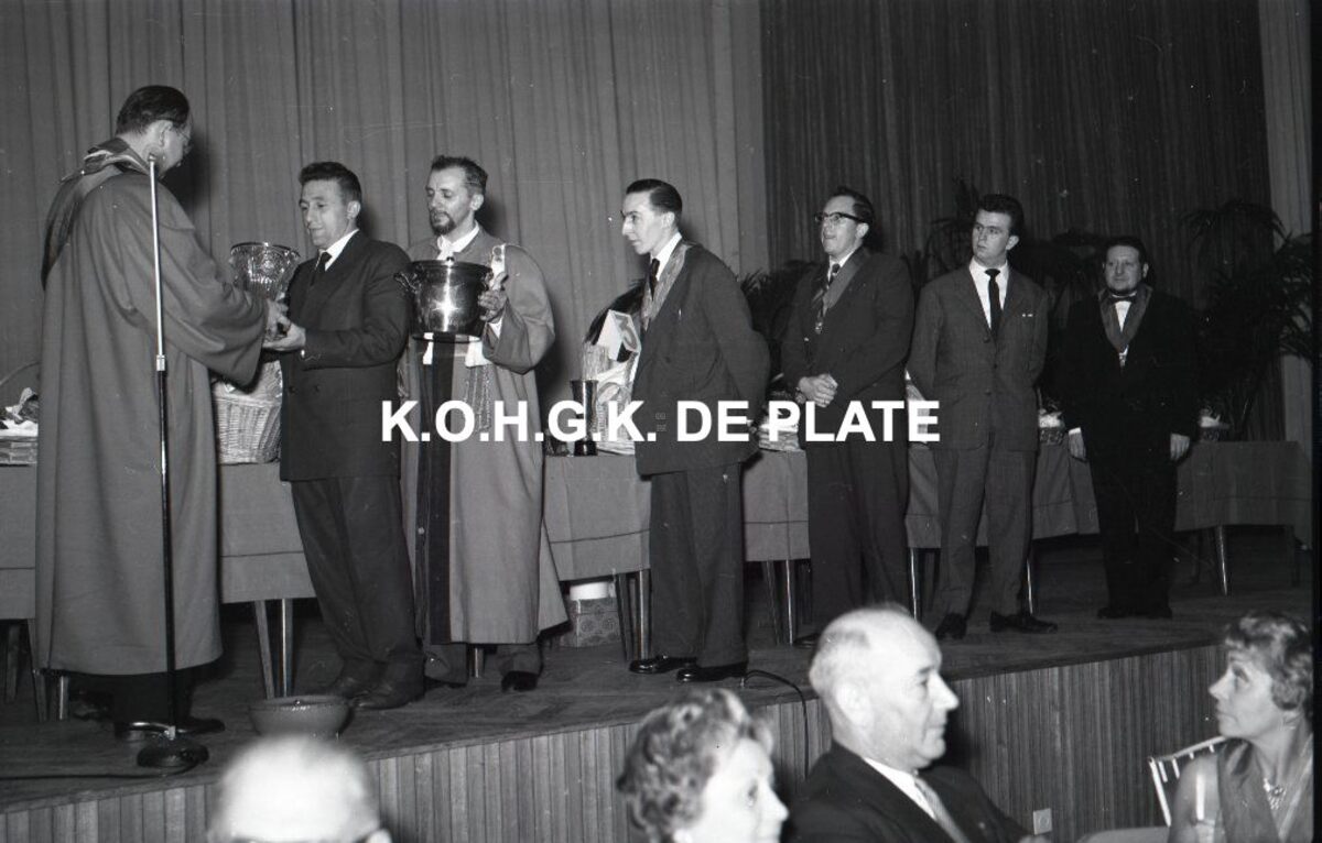Negatief : 6 x 9 cm. - De deelnemers aan de kookwedstrijd "Prosper Montagné" ontvangen hun prijs uit de handen van Roger De Ramée, voorzitter van de "Club Prosper Montagné".