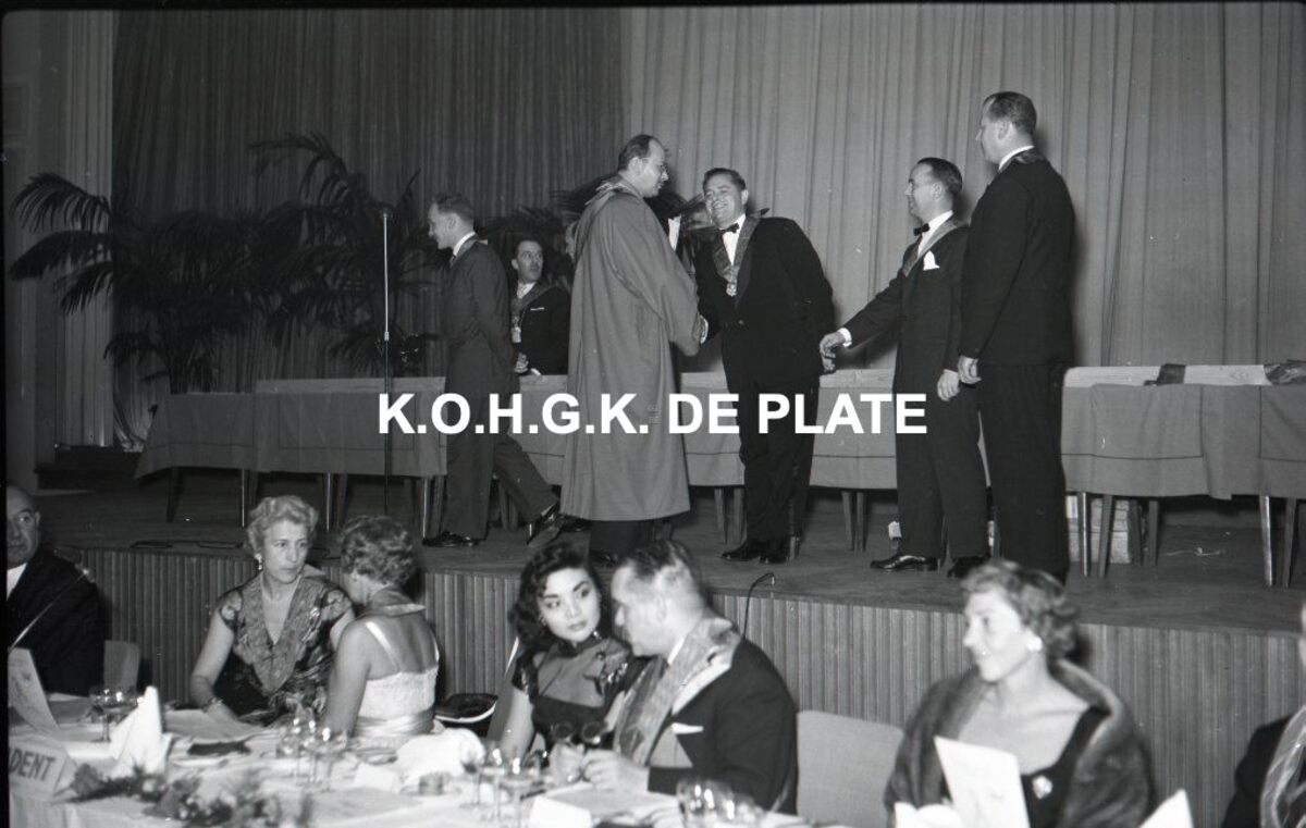 Negatief : 6 x 9 cm. - De deelnemers aan de kookwedstrijd "Prosper Montagné" krijgen felicitaties van Roger De Ramée, voorzitter van de "Club Prosper Montagné". Burgemeester Adolf Van Glabbeke in gesprek met mevrouw Tsuan Liou.
