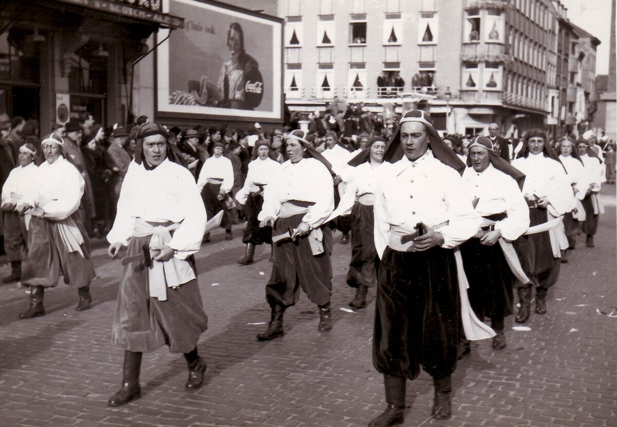 De carnavalgroep "Ali Baba en de 40 rovers" op het Wapenplein. Links het hotel "Royal Nord" en ernaast reclamepaneel voor "Coca Cola".