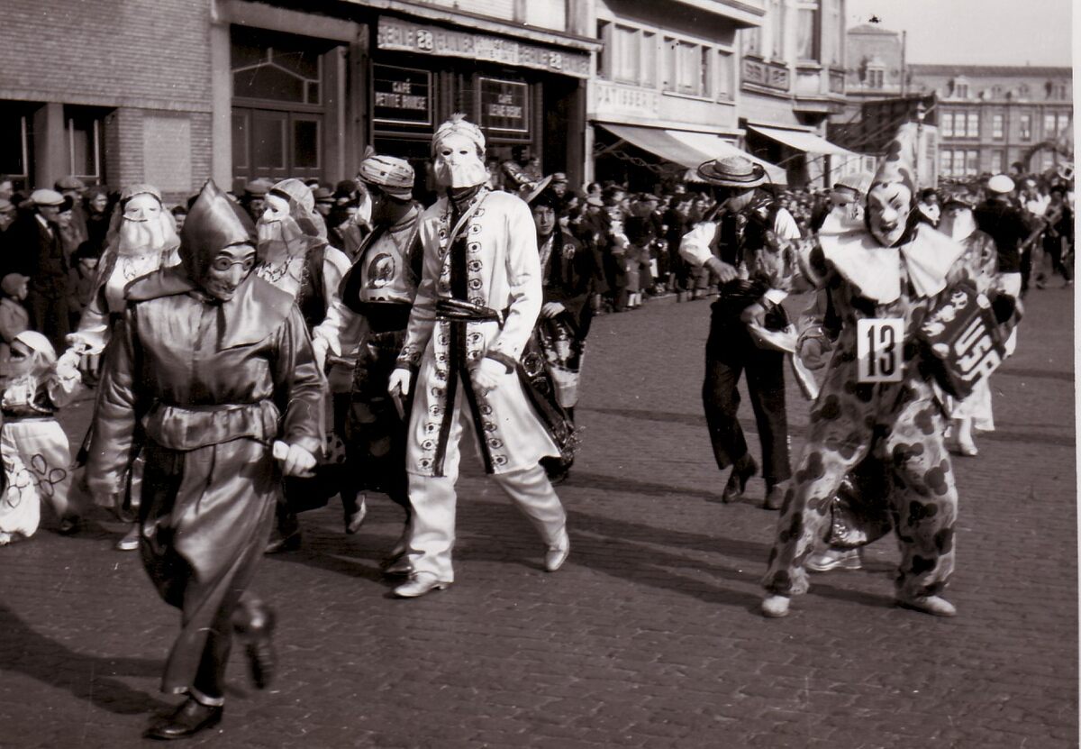 Halfvastenstoet op het Sint-Petrus en Paulusplein ter hoogte van café "Petite Bourse". Op de achtergrond het Zeestation.