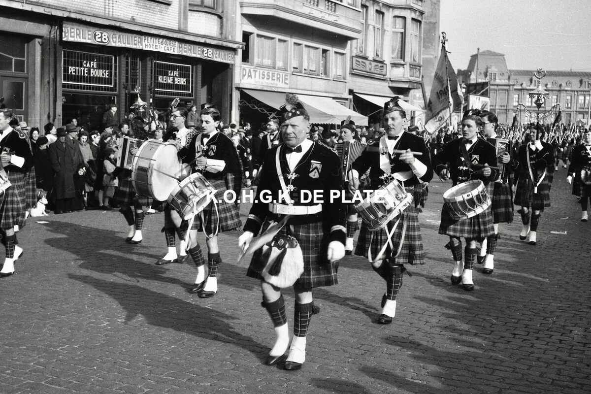 Negatief : 4 x 6,5 cm. - De Oostendse muziekmaatschappij "Ostendia Schotten", hier op het Sint Petrus en Paulusplein.