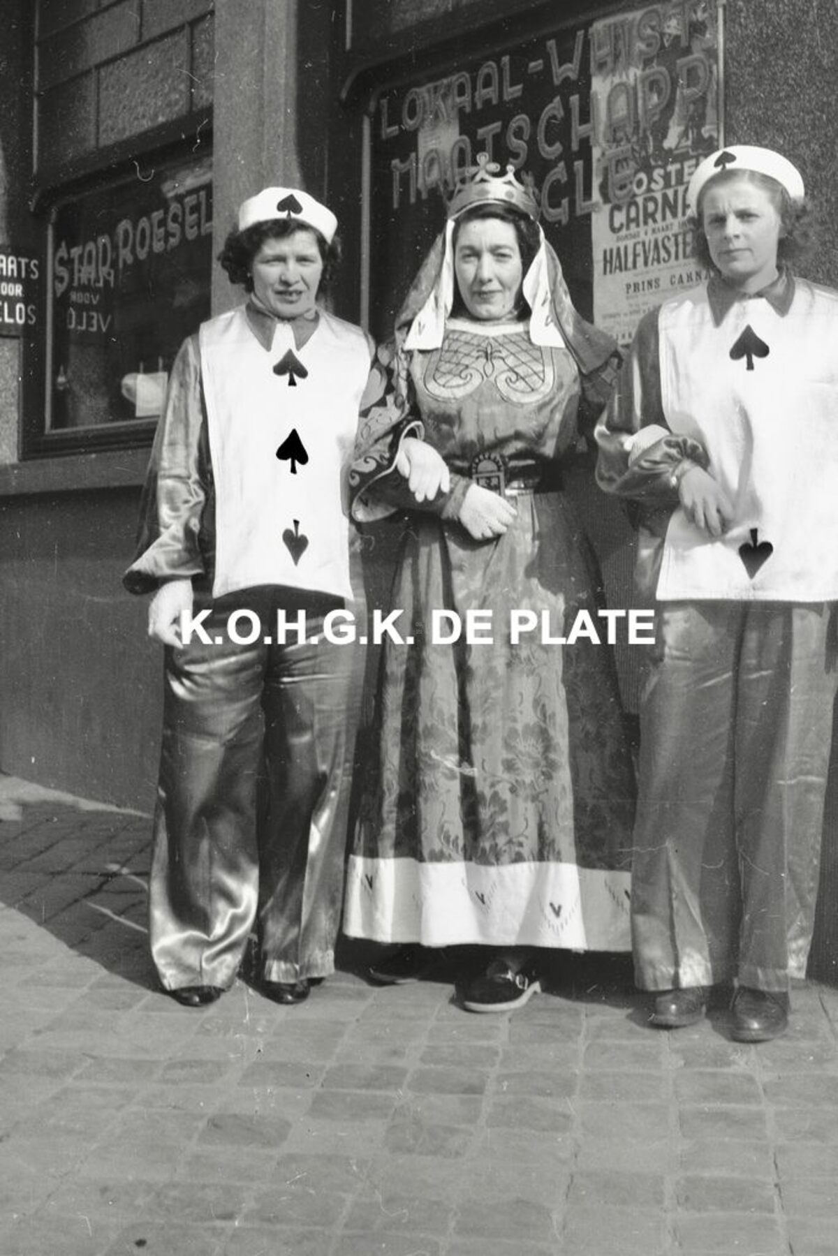 Formaat : 12,5 x 19 cm. - Drie vrouwen van de carnavalgroep "Het Kaartspel" voor hun lokaal van de kaartersclub "L'Aigle du Whist" in café "Stad Roeselare"