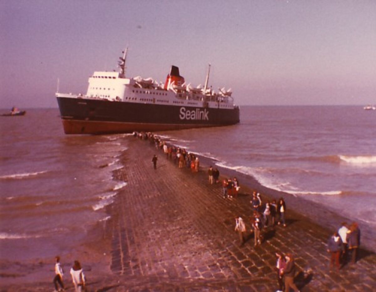 5 foto's in kleur : 13 x 10 cm.. De "Vortigern" strandde op een golfbreker ter hoogte van de Vlaanderenstraat. Het vaartuig werd op 6 maart door vijf sleepboten van de "Unie van Reddings- en Sleepdiensten" vlot getrokken.