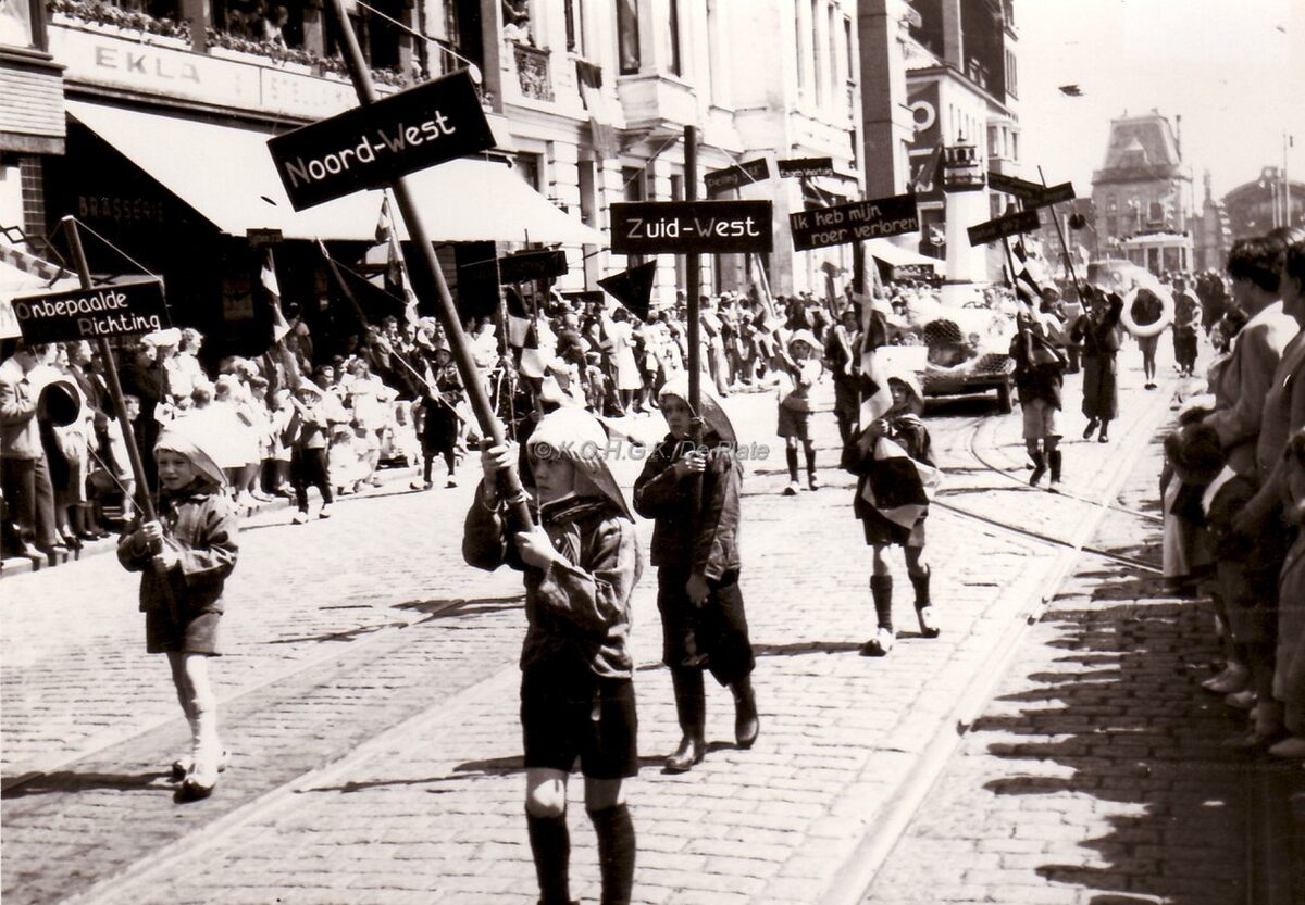 De stoet van de Zeewijding op de Vindictivelaan ter hoogte van de Kapellestraat. De jongens dragen bordjes met de windrichtingen.
