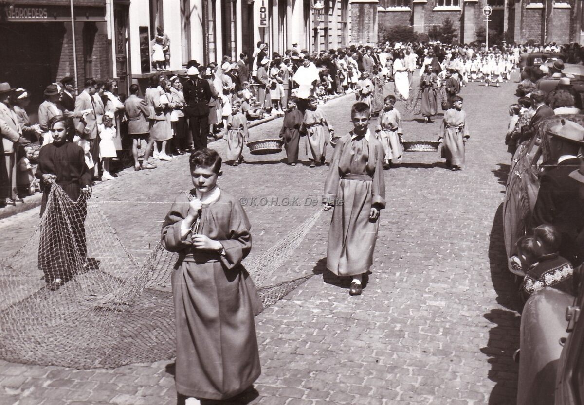 De stoet van de Zeewijding in de Dekenijstraat. Links de uitgang van de werkhuizen van de Gebroeders Valcke.