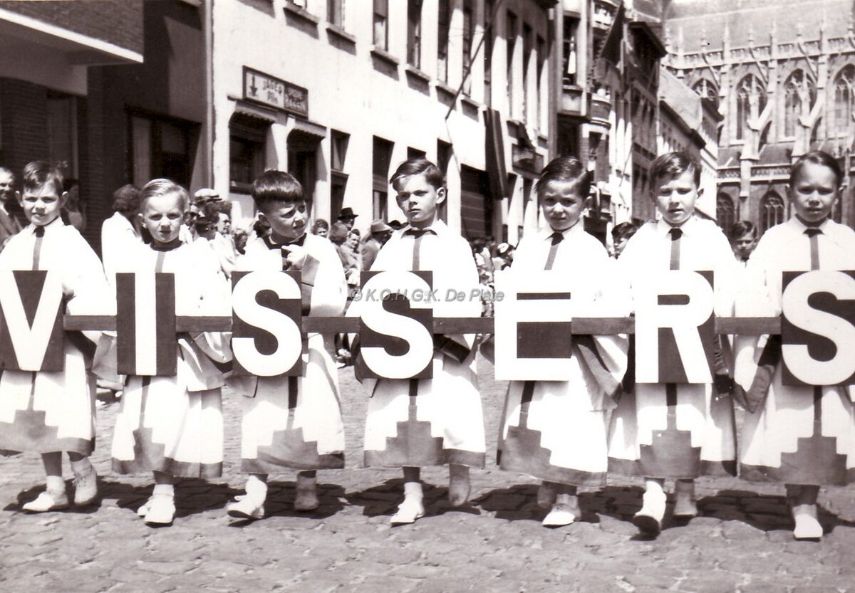 De stoet van de Zeewijding in de Dekenijstraat. Achteraan de Sint Petrus en Pauluskerk en de Jozef II-straat.