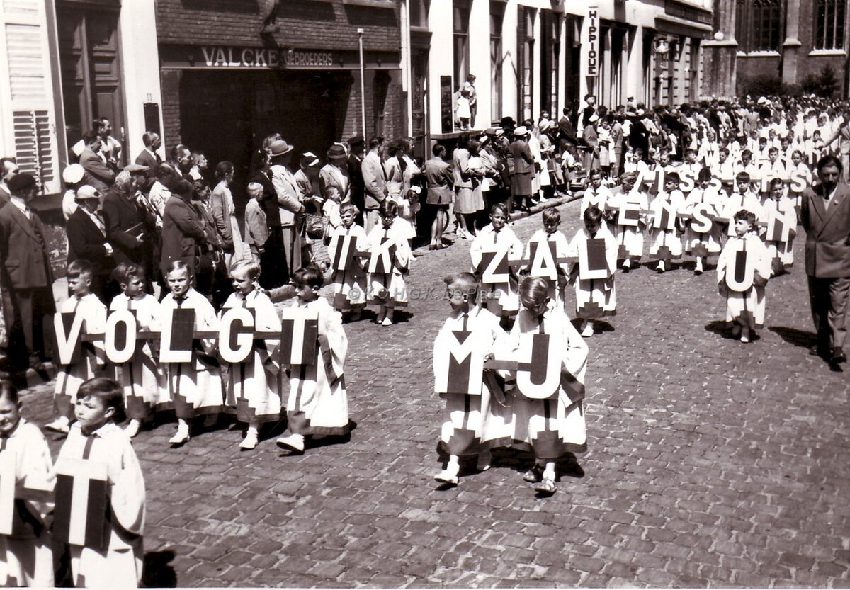 De stoet van de Zeewijding in de Dekenijstraat.Links de uitgang der werkhuizen van de gebroeders Valcke.Op de achtergrond de Jozef II-straat. De groep werd elk jaar gevormd door de eerste communicanten van het Klein College, rechts schoolhoofd Maurice Proot