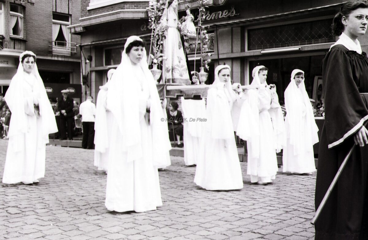 Zeewijding 1954. Het beeld van Onze Lieve Vrouw op het Wapenplein, gedragen door Oostendse meisjes.