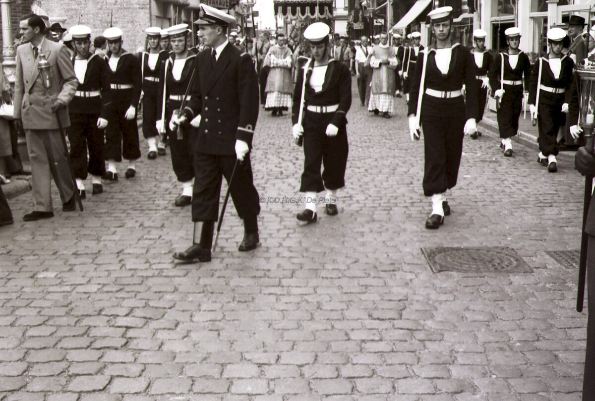 Een detachement van de Zeemacht beschermt het Heilig Sacrament in de Zeewijding. Ze komen aan op het Wapenplein.