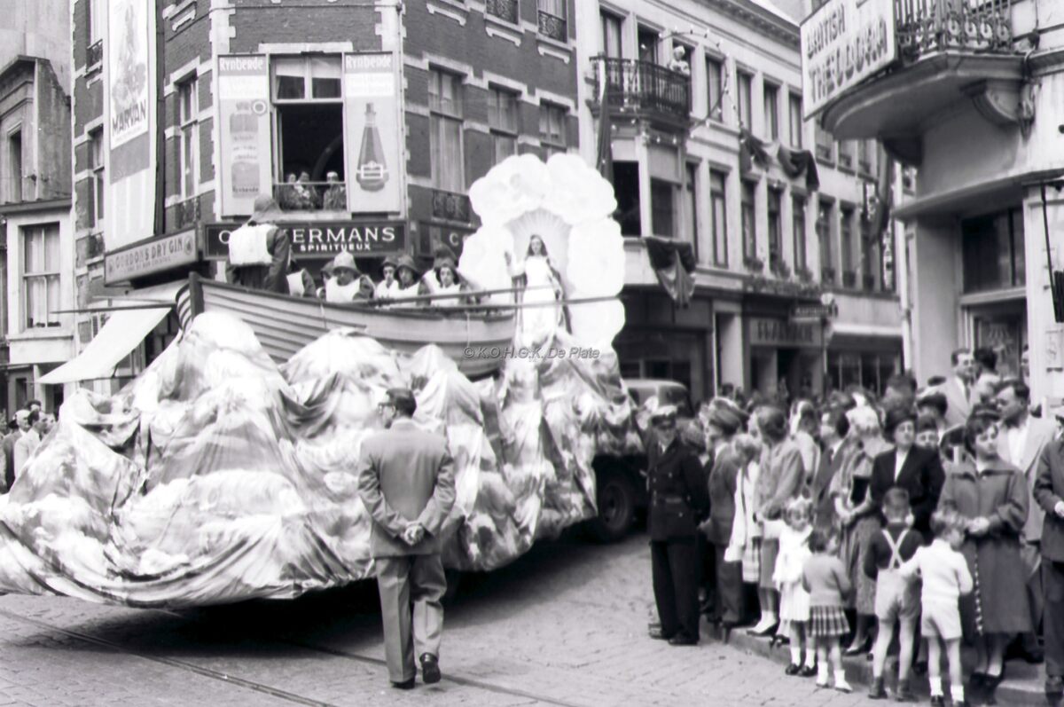 Een praalwagen uit de optocht van de Zeewijding draait de Kapellestraat in van uit de Jozef II-straat.
