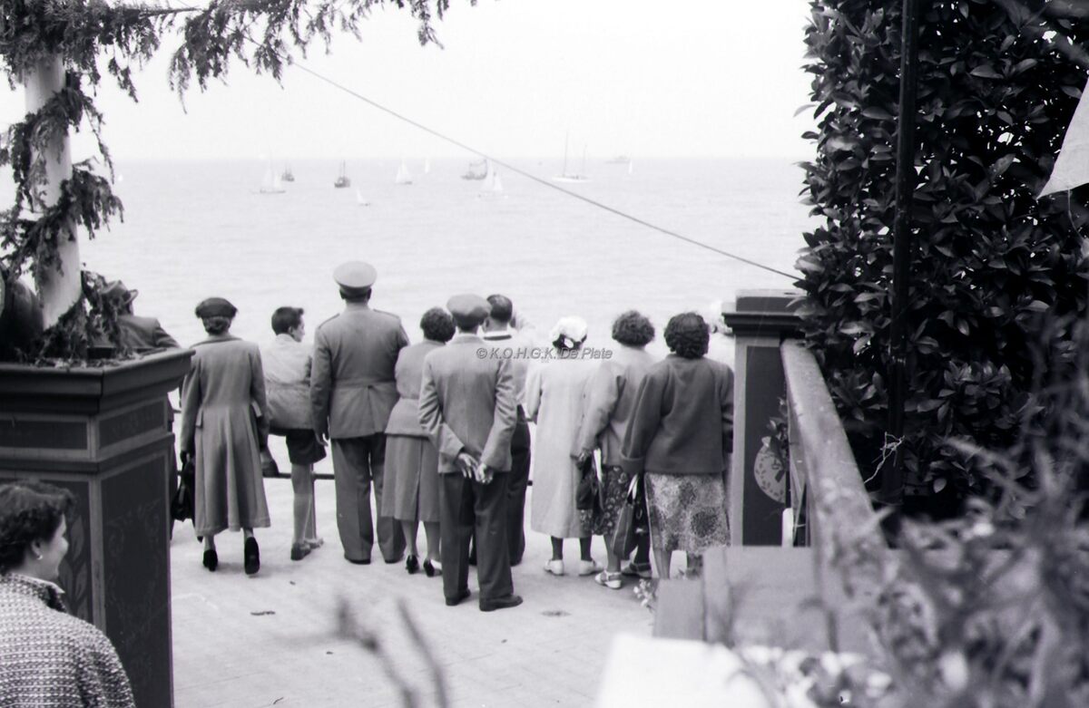 Enige toeschouwers op het podium van waarop de zee gezegend werd tijdensde Zeewijding 1954.