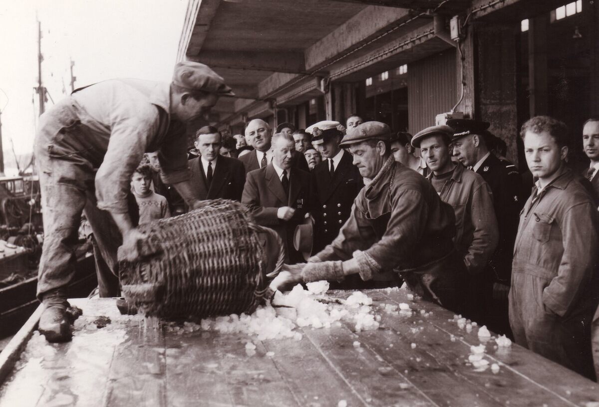 Formaat : 13 x 18 cm. - Prins Albert bezoekt de Vismijn en ziet de vislossers aan het werk.Tweede van links naast de prins, de provinciegouverneur van West-Vlaanderen Pierre van Outryve d'Ydewalle, en naast hem schepen Maurice Quaghebeur sr. De prins krijgt uitleg van Gustave Velthof, directeur van de vissershaven