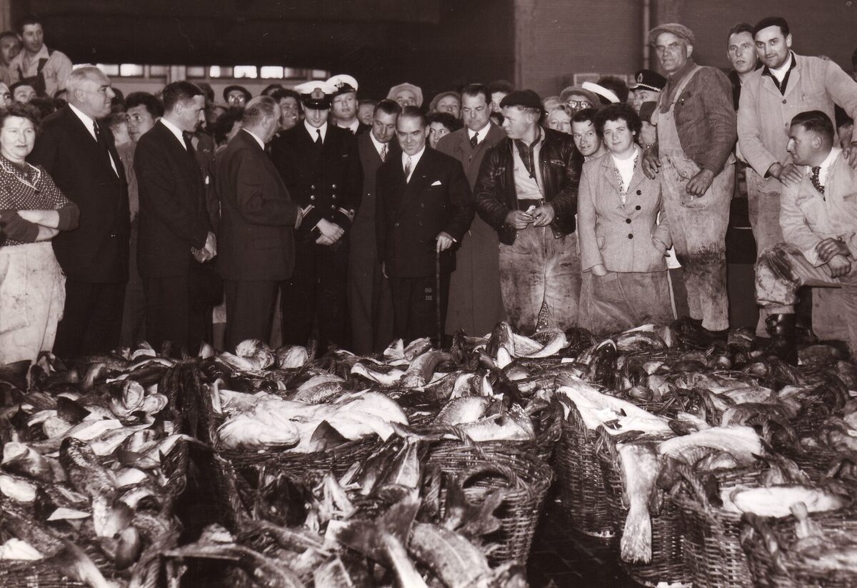 Formaat : 13 x 18 cm. - Prins Albert op bezoek in de Vismijn tijdens de veiling. Rechts, burgemeester Adolf Van Glabbbeke. Links, schepen Maurice Quaghebeur sr. en naast hem provinciegouverneur Pierre van Outryve d'Ydewalle. De prins krijgt uitleg van Gustave Velthof, directeur van de vissershaven.