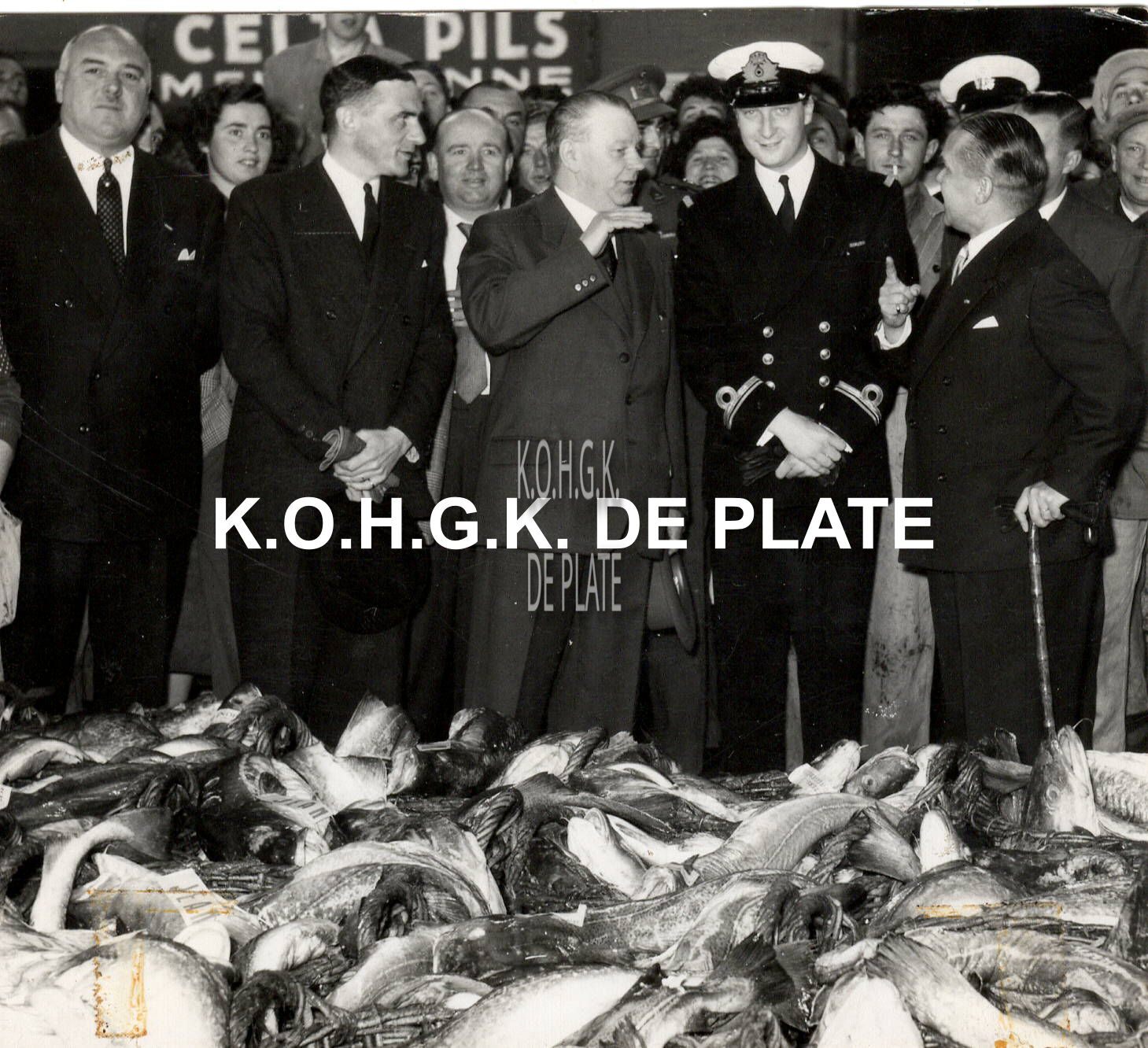 Formaat : 11 x 12,5 cm. - Prins Albert op bezoek in de vismijn tijdens de veiling. Rechts, burgemeester Adolf Van Glabbeke. Links, schepen Maurice Quaghebeur sr. en naast hem provinciegouverneur Pierre van Outryve d'Ydewalle. De prins krijgt uitleg van Gustave Velthof, directeur van de vissershaven.