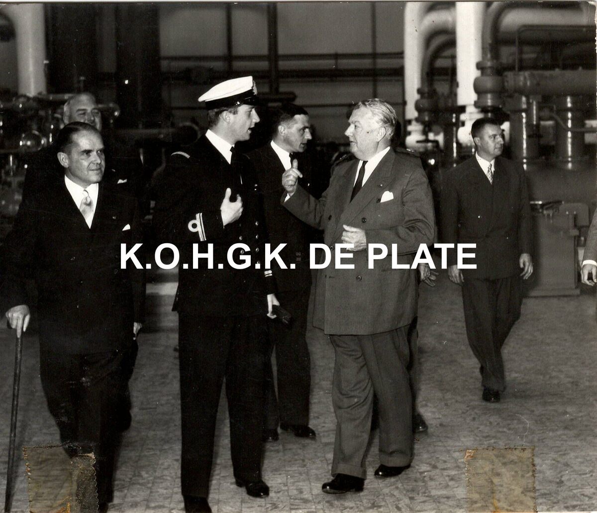 Formaat : 11 x 13 cm. - Prins Albert bezoekt "Les Frigorifères du Littoral", Hendrik Baelskaai 24. Links, burgemeester Adolf Van Glabbeke en achter hem schepen Maurice Quaghebeur sr.. Achter de prins, provinciegouverneur Pierre Van Outryve d'Ydewalle.