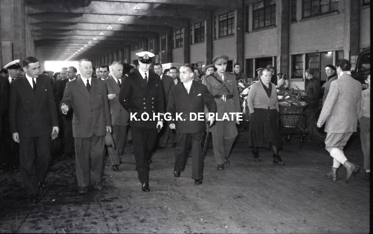 Negatief : 6 x 9 cm. - De prins krijgt uitleg van Gustave Velthof, directeur van de vissershaven. Links, de provinciegouverneur van West-Vlaanderen Pierre van Outryve d'Ydewalle. Rechts naast de prins, burgemeester Adolf Van Glabbeke en de vleugeladjudant van de prins