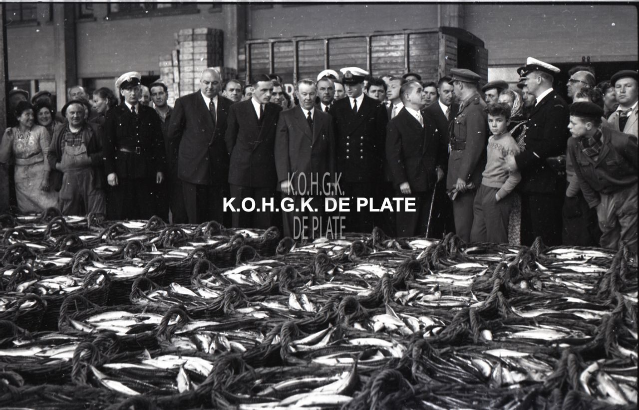 Negatief : 6 x 9 cm. - Links, schepen Maurice Quaghebeur sr., de provinciegouverneur van West-Vlaanderen Pierre van Outryve d'Ydewalle en Gustave Velthof ,directeur van de vissershaven, die uitleg verstrekt aan de prins. Burgemeester Adolf Van Glabbeke en de vleugeladjudant van de prins.