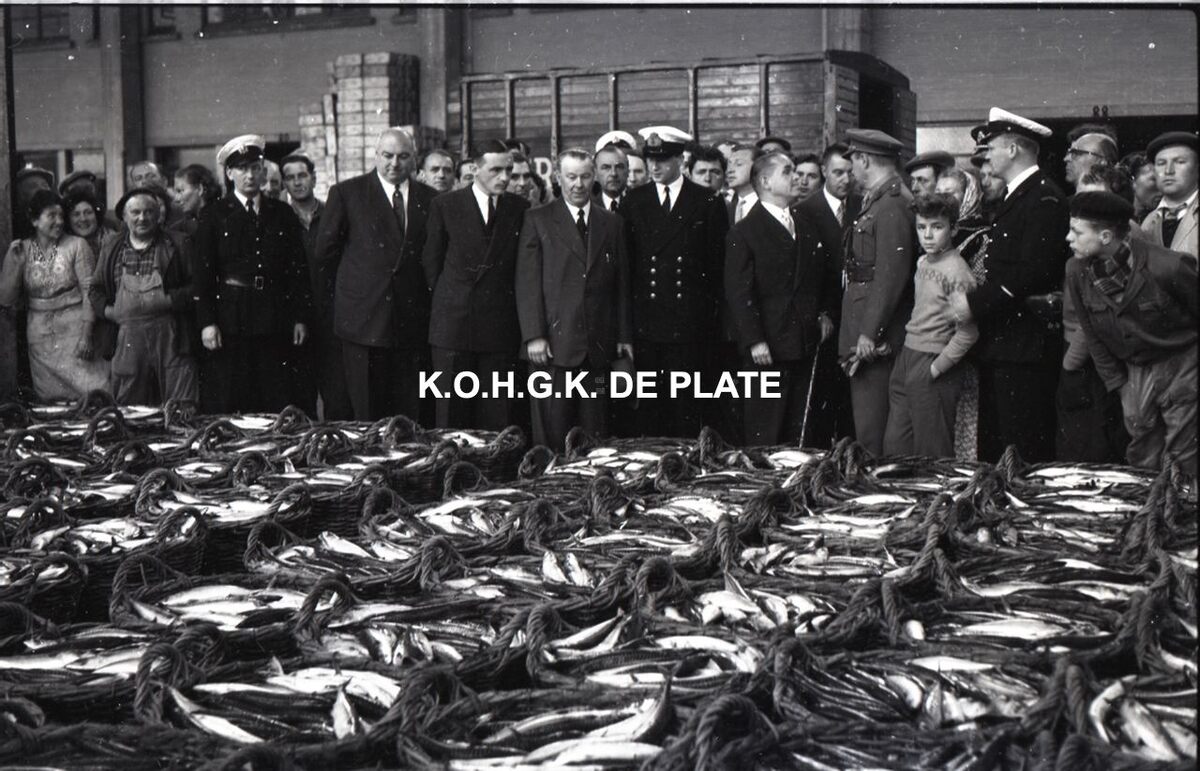 Negatief : 6 x 9 cm. - Links, schepen Maurice Quaghebeur sr., de provinciegouverneur van West-Vlaanderen Pierre van Outryve d'Ydewalle en Gustave Velthof ,directeur van de vissershaven, die uitleg verstrekt aan de prins. Burgemeester Adolf Van Glabbeke en de vleugeladjudant van de prins.