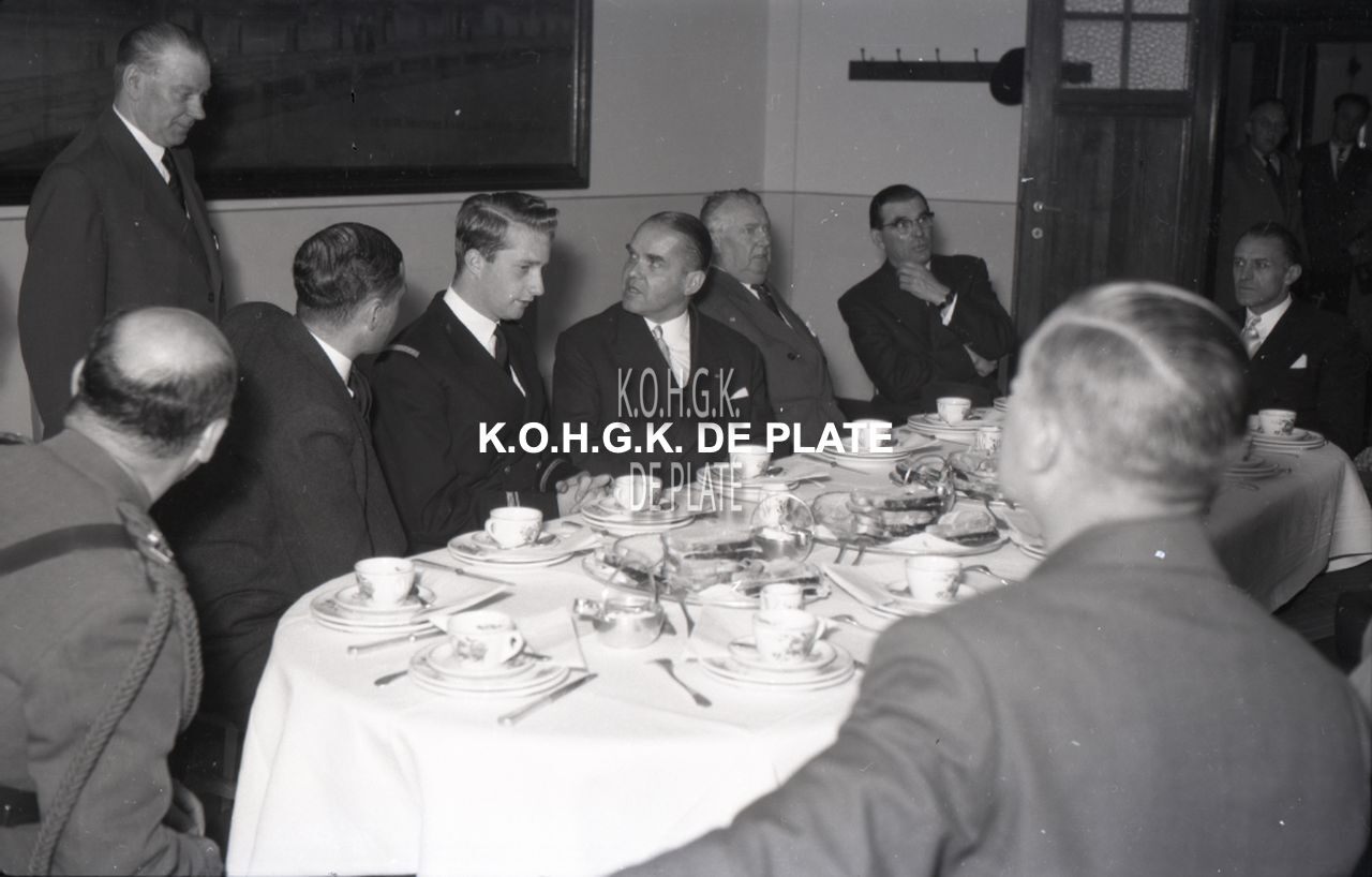 Negatief : 6 x 9 cm. - De prins in het bestuursgebouw waar hij kennis maakte met de twee oudste visverkopers, Adolf Janssens, 58 jaar in de vismijn en Eduard Beauprez, 56 jaar in de vismijn. Ook kapitein en gemeenteraadslid Arseen Blondé was aanwezig