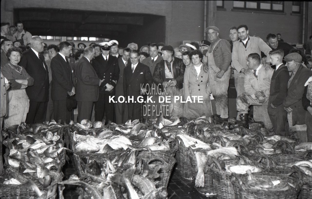 Negatief : 6 x 9 cm. - Formaat : 13 x 19 cm. - De prins tussen de vissersgemeenschap en bennen kabeljauw. Van links naar rechts, schepen Maurice Quaghebeur, de provinciegouverneur van West-Vlaanderen Pierre van Outryve d'Ydewalle, Gustave Velthof, directeur van de vissershaven die uitleg heeft aan de prins en burgemeester Adolf Van Glabbeke