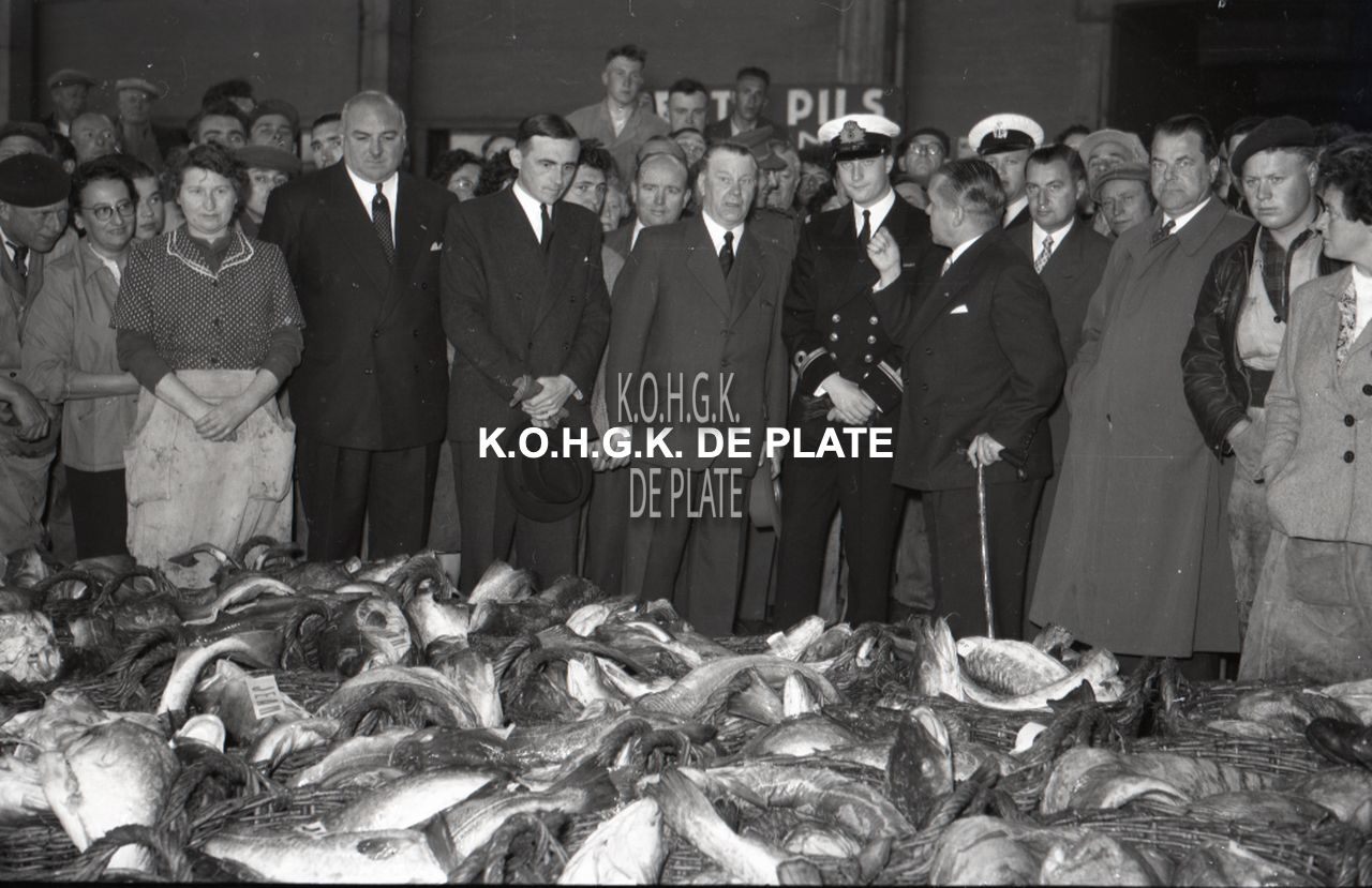 Negatief : 6 x 9 cm. - De prins tussen de vissersgemeenschap en bennen kabeljauw. We herkennen o.a. van links naar rechts : Maurice Quaghebeur sr., schepen, Pierre van Outryve d'Ydewalle, provinciegouverneur, Gustave Velthof, directeur van de vissershaven, de prins en burgemeester Adolf Van Glabbeke