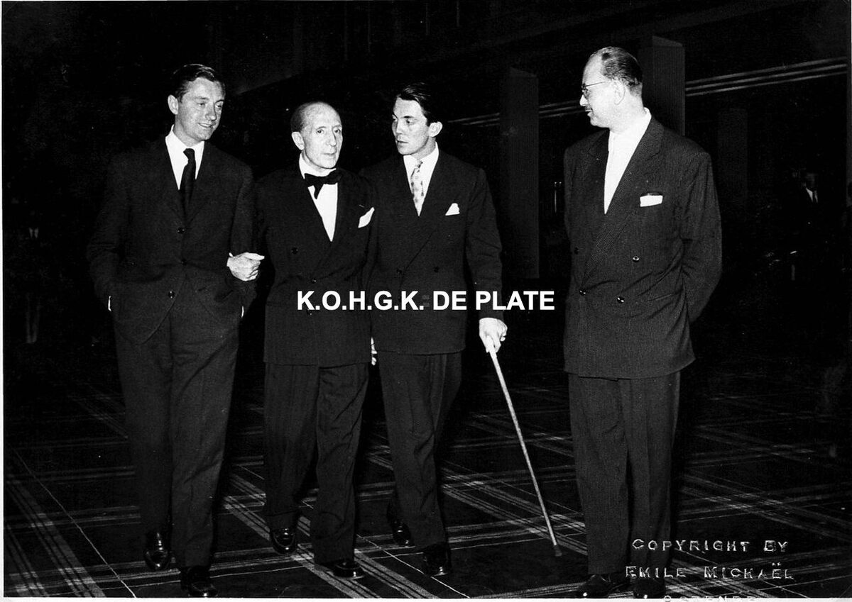 Formaat : 13 x 18 cm. - Marquis de Cuevas in gezelschap. Rechts, Roger De Ramée, directeur van het Kursaal.