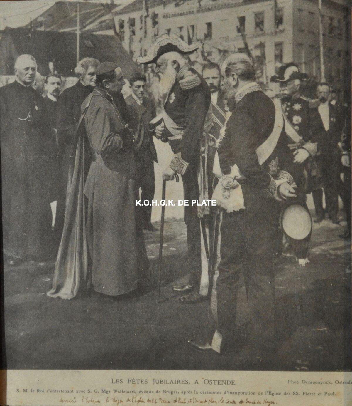 Extra tekst geschreven : derrière l’évecque le doyen de l’église de SS Pierre et Paul, A l’avant plan le comte de Smet de Naeyer. - Op 4 september 1905 werd de Sint Petrus en Pauluskerk met veel luister ingehuldigd door monseigneur Gustave Joseph Waffelaert, 22ste bisschop van Brugge, in aanwezigheid van koning Leopold II en tal van prominenten. Pas drie jaar later, op 31 augustus, werd de kerk plechtig ingewijd door bisschop Waffelaert.