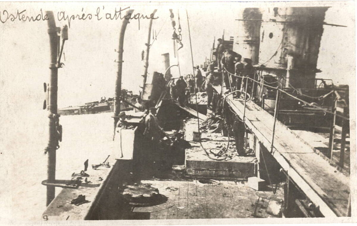 De aan de grond gelopen Britse kruisers H.M.S. Sirius en H.M.S. Brilliant na de tweede mislukte blokkade poging van de havengeul van Oostende op 22-23 april 1918.