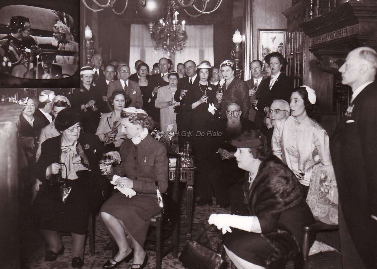 Drink in huize Monaco aan de Van Iseghemlaan, consulaat van Monaco en tevens woning van de familie PORTA. Uiterst rechts staat Marie-Jozef PORTA, consul van Monaco en schepen,derde van rechts zittend deken BUTAYE ,achteraan links burgemeester Adolf VAN GLABBEKE en mevrouw,in de rechter hoek achteraan John HERMANS,journalist en gemeenteraadslid. Samenkomst ter gelegenheid van het huwelijk Rainier van Monaco met Grace KELLY.