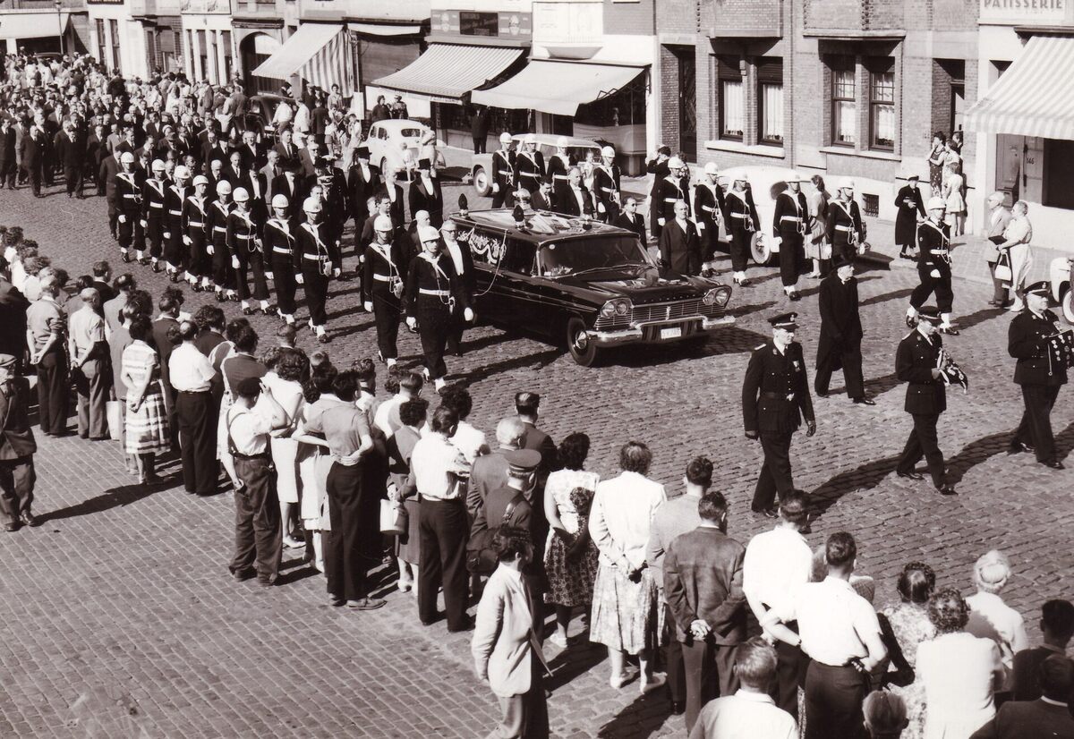 Formaat : 13 x18 cm. - De begrafenisstoet van burgemeester Adolphe Van Glabbeke op de Torhoutsesteenweg ter hoogte van het Prof. Mac Leodplein.