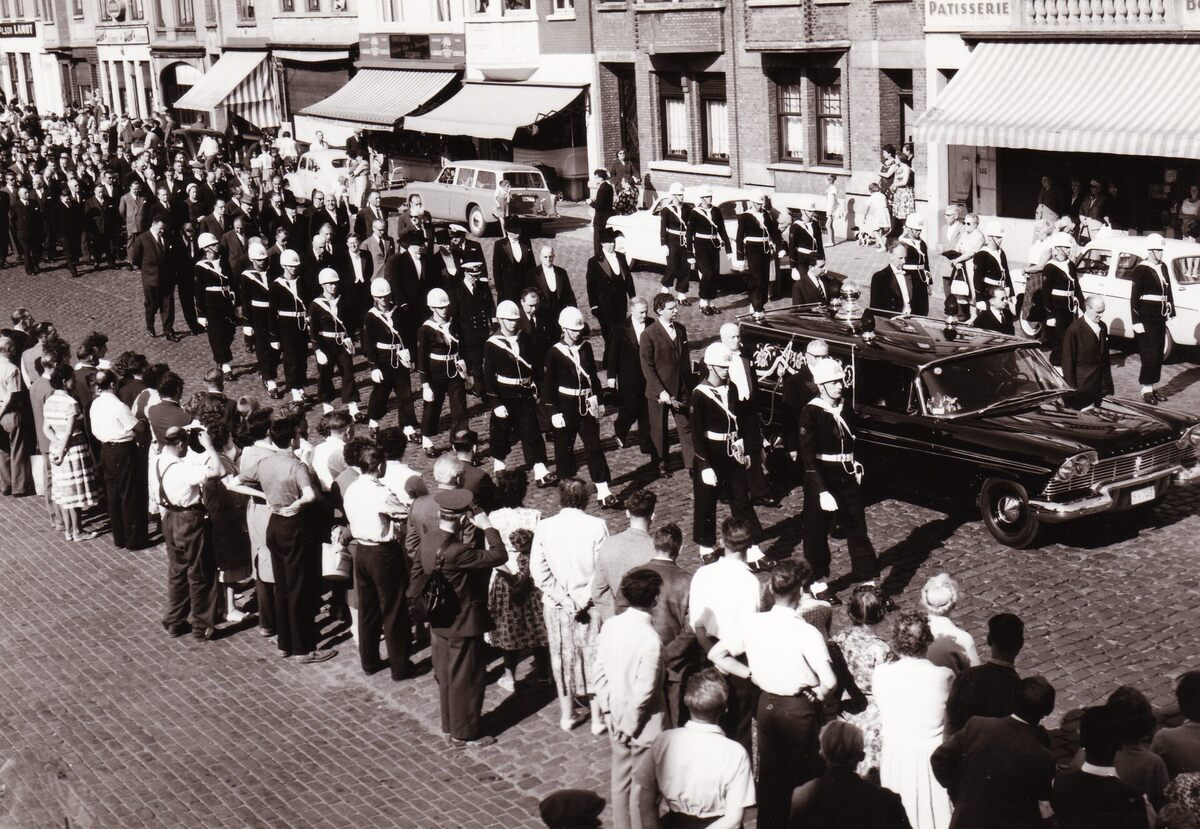 Formaat 13 x 18 cm. - De lijkwagen met burgemeester Adolf Van Glabbeke op de Torhoutsesteenweg aan het Prof. Mac Leodplein op weg naar het kerkhof in de Stuiverstraat. Achter de lijkwagen loopt minister Willy Declercq.